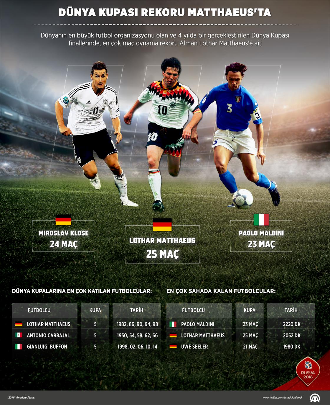 Dünyanın en büyük futbol organizasyonu olan ve 4 yılda bir gerçekleştirilen Dünya Kupası finallerinde, en çok maç oynama rekoru Alman Lothar Matthaeus'e ait. Matthaeus, dünya kupalarında tam 25 kez forma giyerken, ulaşılması zor bir rekora imza attı. Alman futbolcu Miroslav Klose, 24 maçla ikinci, İtalyanların savunma oyuncusu Paolo Maldini, 23 maçla üçüncü sırada yer alırken, Arjantin'in ve dünya futbolunun efsane ismi Diego Armando Maradona, Polonyalı Wladislav Zmuda ve Alman Uwe Seeler 21'er maçla, Matthaeus, Klose ve Maldini'yi izledi. ( Kemal Delikmen - Anadolu Ajansı )12 Haziran 2018•Güncelleme: 12 Haziran 2018