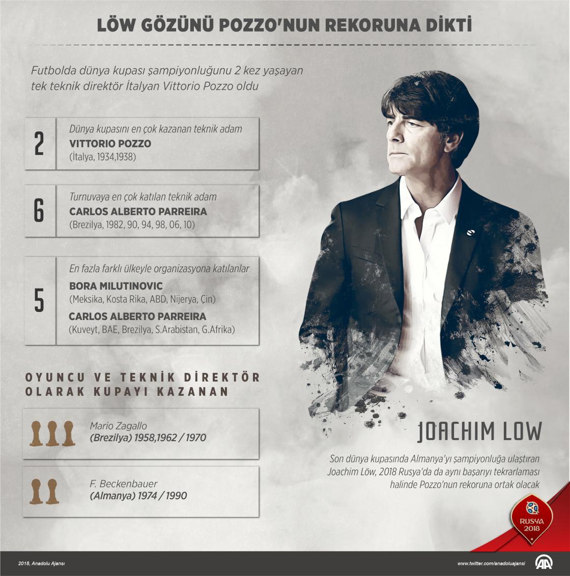 Futbolda Dünya Kupası şampiyonluğunu iki kez yaşayan tek teknik direktör İtalyan Vittorio Pozzo oldu. Pozzo'nun çalıştırdığı İtalya, 1934'te İtalya'da düzenlenen şampiyonada ve 1938'de Fransa'daki turnuvada üst üste iki kez şampiyonluğa ulaştı. Pozzo'dan sonra organizasyon tarihinde bu sevinci iki kez yaşayan başka bir teknik adam çıkmadı. Son Dünya Kupası'nda Almanya'yı şampiyonluğa ulaştıran Joachim Löw, 2018 Rusya'da da aynı başarıyı tekrarlaması halinde Pozzo'nun rekoruna ortak olacak. ( Kemal Delikmen - Anadolu Ajansı )13 Haziran 2018•Güncelleme: 13 Haziran 2018