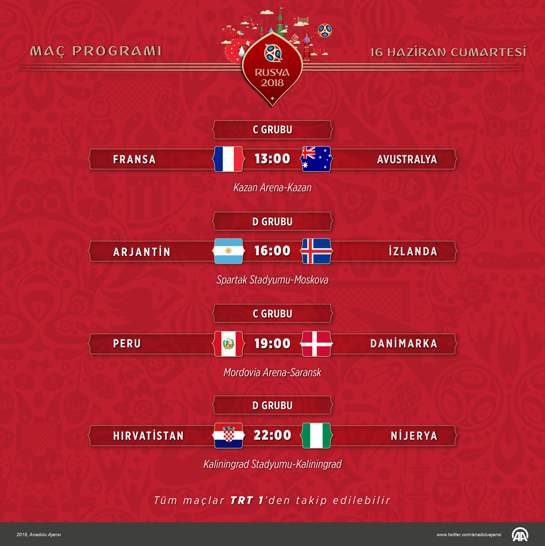 2018 FIFA Dünya Kupası'nda bugün oynanacak 4 maçın 3'ünde takımlar ilk kez birbirleriyle karşı karşıya gelecek. ( Kemal Delikmen - Anadolu Ajansı )