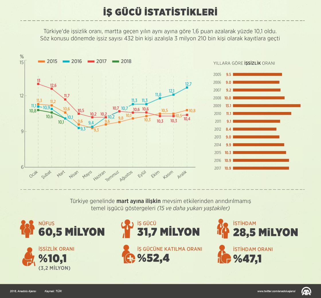 Türkiye'de işsizlik oranı, martta geçen yılın aynı ayına göre 1,6 puan azalarak yüzde 10,1 oldu. Söz konusu dönemde işsiz sayısı 432 bin kişi azalışla 3 milyon 210 bin kişi olarak kayıtlara geçti. ( Murat Usubaliev - Anadolu Ajansı )