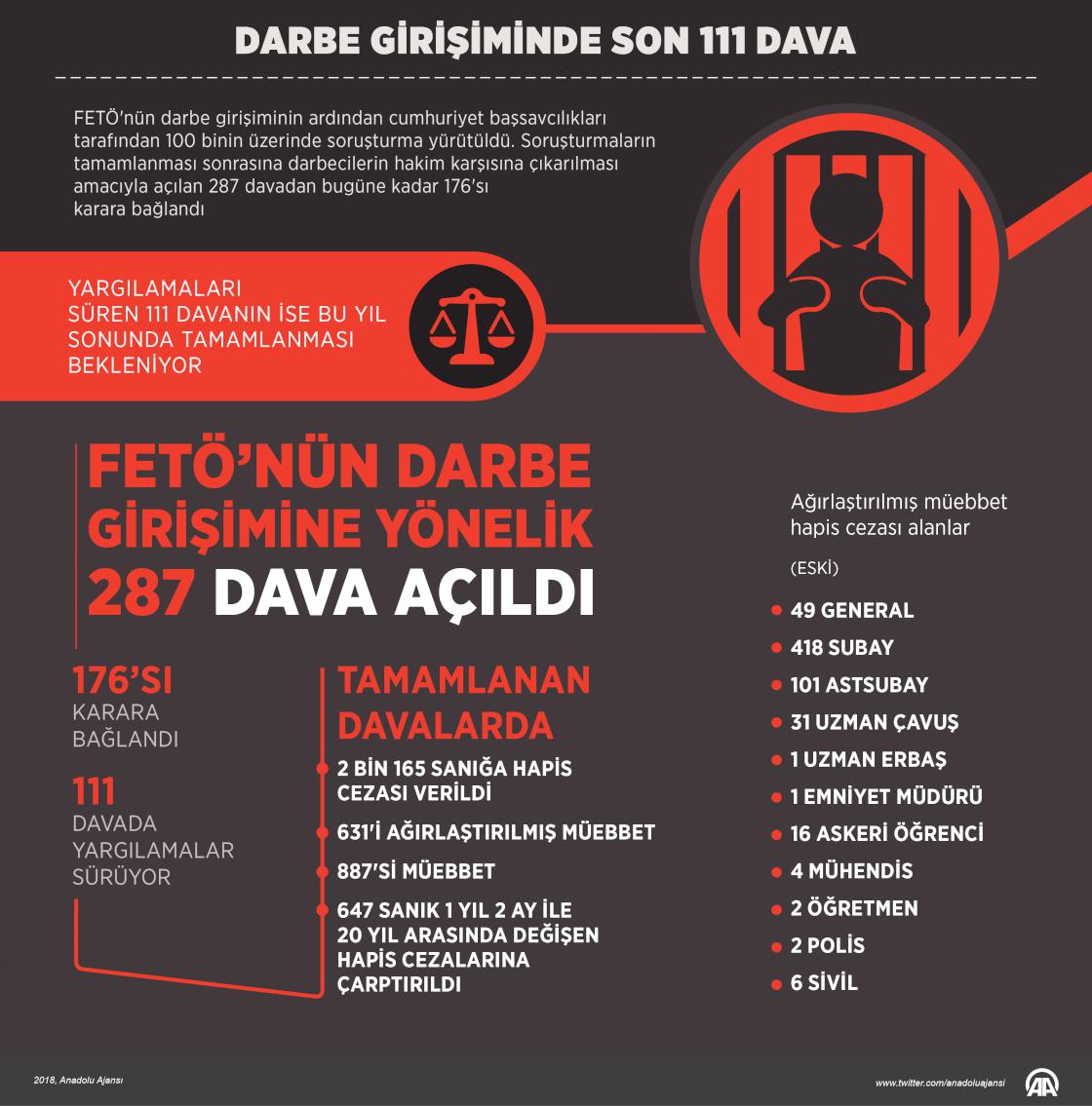 FETÖ'nün darbe girişiminin ardından cumhuriyet başsavcılıkları tarafından 100 binin üzerinde soruşturma yürütüldü. Soruşturmaların tamamlanması sonrasına darbecilerin hakim karşısına çıkarılması amacıyla açılan 287 davadan bugüne kadar 176'sı karara bağlandı.