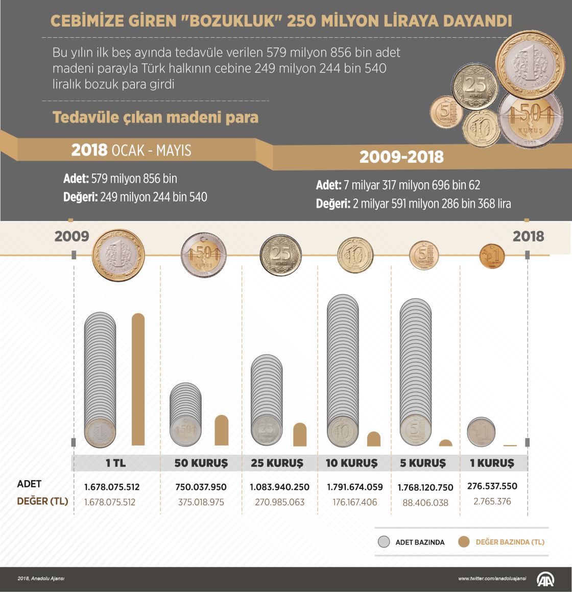 Bu yılın ilk beş ayında tedavüle verilen 579 milyon 856 bin adet madeni parayla Türk halkının cebine 249 milyon 244 bin 540 liralık bozuk para girdi. Türk halkının cebindeki madeni ufaklık paraların toplam değeri 2009'dan bu yana 2 milyar 591 milyon 286 bin 368 lira oldu. ( Muhammed Ali Yiğit - Anadolu Ajansı )18 Haziran 2018•Güncelleme: 18 Haziran 2018