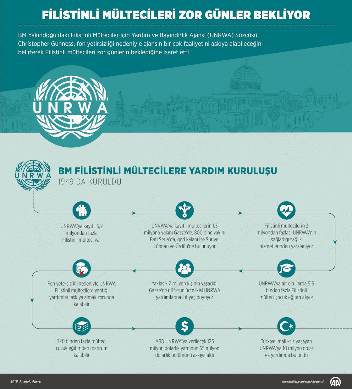 BM Filistinli Mültecilere Yardım Kuruluşu (UNRWA) Sözcüsü Christopher Gunness, fon yetersizliği nedeniyle ajansın birçok faaliyetini askıya alabileceğini belirterek, Filistinli mültecileri zor günlerin beklediğini söyledi.