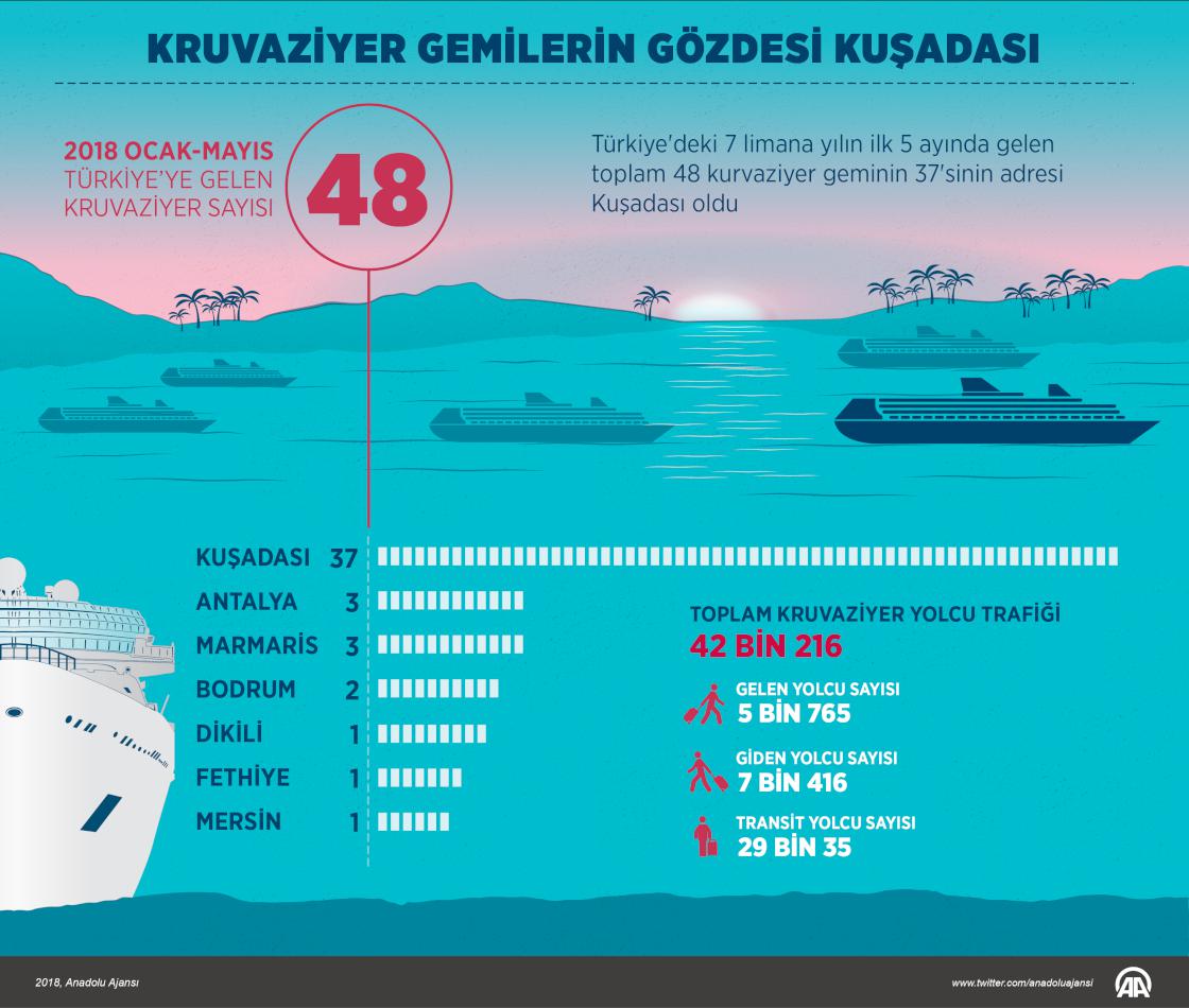 Deniz Ticaret Genel Müdürlüğü verilerinden yapılan hesaplamaya göre, bu yılın ocak-mayıs döneminde Türkiye'deki 7 limana toplam 48 kruvaziyer gemi yanaştı. Bu gemilerden gelen yolcu sayısı 5 bin 765, giden yolcu sayısı 7 bin 416, transit yolcu sayısı ise 29 bin 35 olarak kayıtlara geçti. ( Murat Usubaliev - Anadolu Ajansı )25 Haziran 2018•Güncelleme: 25 Haziran 2018