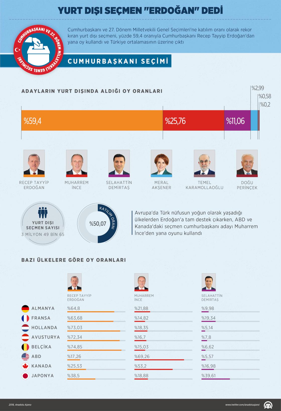 Cumhurbaşkanı ve 27. Dönem Milletvekili Genel Seçimleri'ne katılım oranı olarak rekor kıran yurt dışı seçmeni, yüzde 59,4 oranıyla Cumhurbaşkanı Recep Tayyip Erdoğan'dan yana oy kullandı ve Türkiye ortalamasının üzerine çıktı.