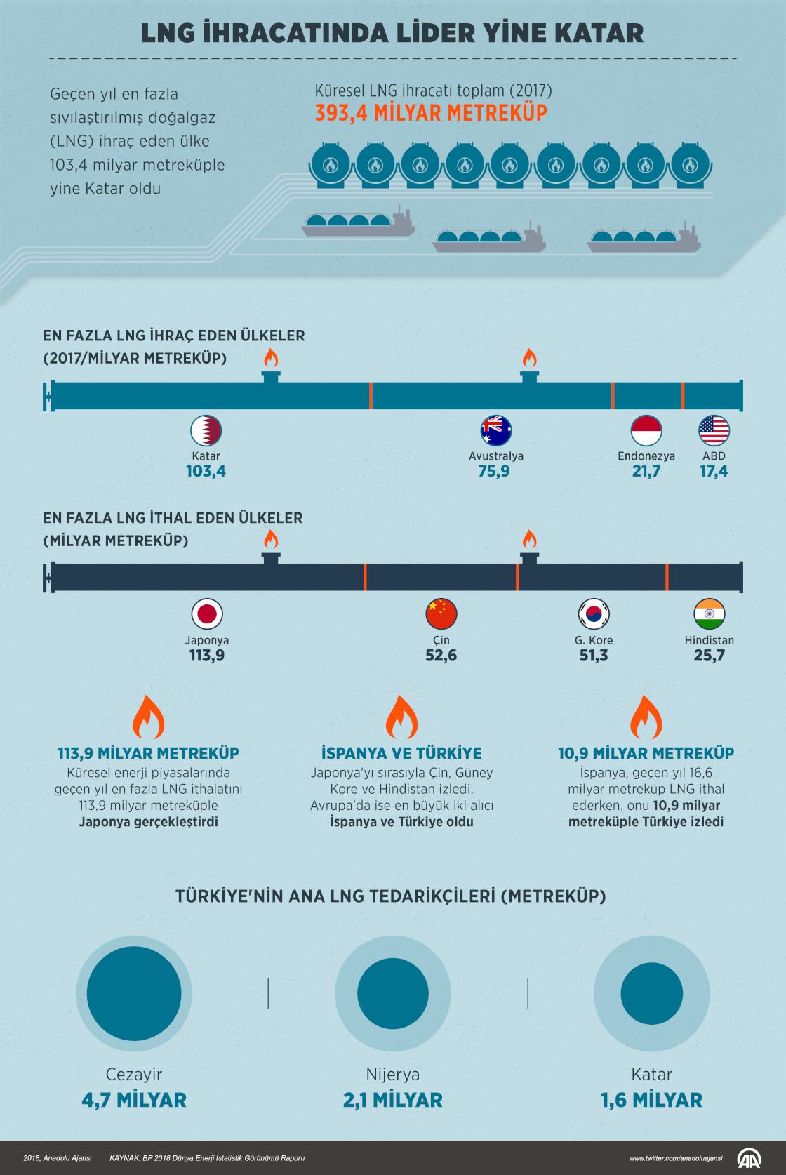 "BP 2018 Dünya Enerji İstatistik Görünümü Raporu"ndan yaptığı derlemeye göre, geçen yıl dünyada toplam 393,4 milyar metreküp LNG ihracatı yapıldı. Buna göre, LNG'nin ana alıcısı Asya-Pasifik ülkeleri olarak kayıtlara geçti. Bu bölgeden sonraki en büyük alıcı Avrupa oldu. ( Muhammed Ali Yiğit - Anadolu Ajansı )26 Haziran 2018•Güncelleme: 26 Haziran 2018