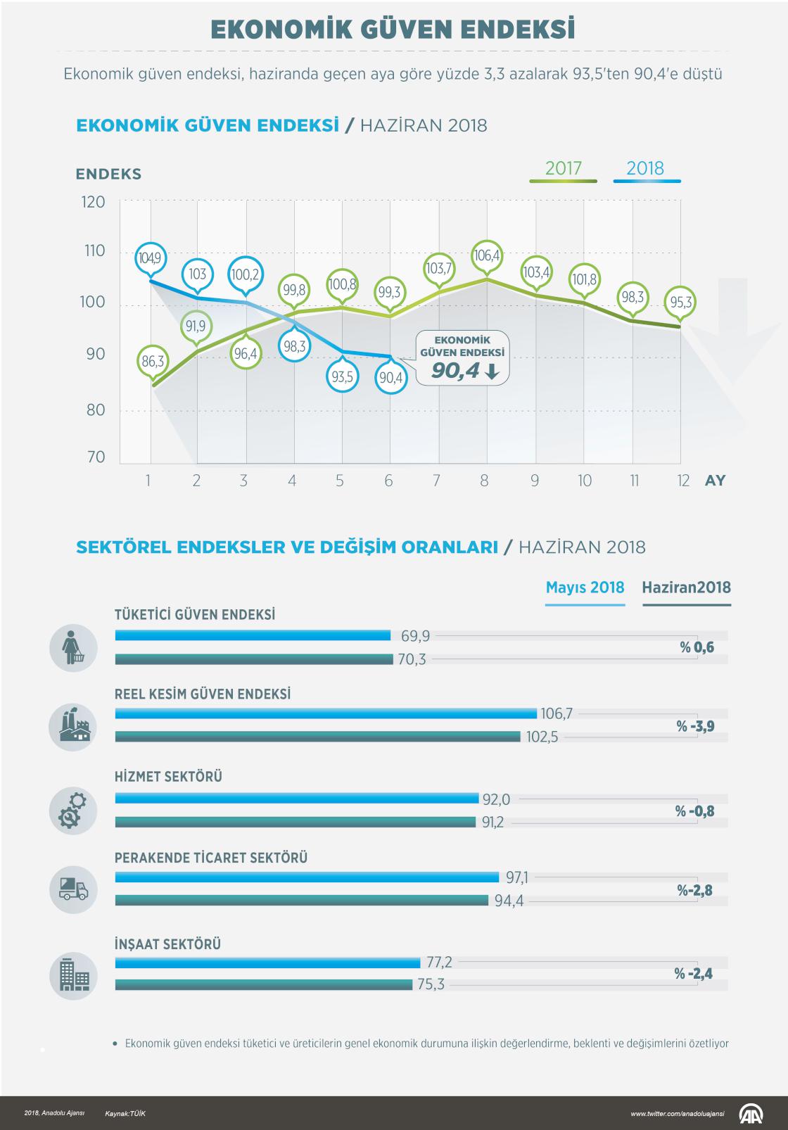 Ekonomik güven endeksi, haziranda geçen aya göre yüzde 3,3 azalarak 93,5'ten 90,4'e düştü ( Gözde Gültekinler - Anadolu Ajansı )