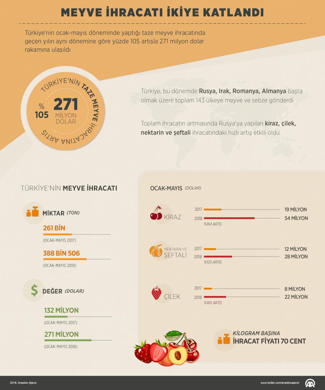 Anadolu'nun verimli topraklarında yetişen meyvelere dünyanın dört bir yanından talebin artmasıyla bu ürünlerin ihracatı da ocak-mayıs döneminde geçen yıla göre ikiye katlanarak 271 milyon dolara yükseldi. Türkiye, bu dönemde Rusya, Irak, Romanya, Almanya başta olmak üzere toplam 143 ülkeye meyve ve sebze gönderdi. Taze meyve ihracatındaki artışta Rusya'ya yapılan kiraz, çilek, nektarin ve şeftali satışındaki hızlı yükseliş etkili oldu. ( Kemal Delikmen - Anadolu Ajansı )28 Haziran 2018•Güncelleme: 28 Haziran 2018