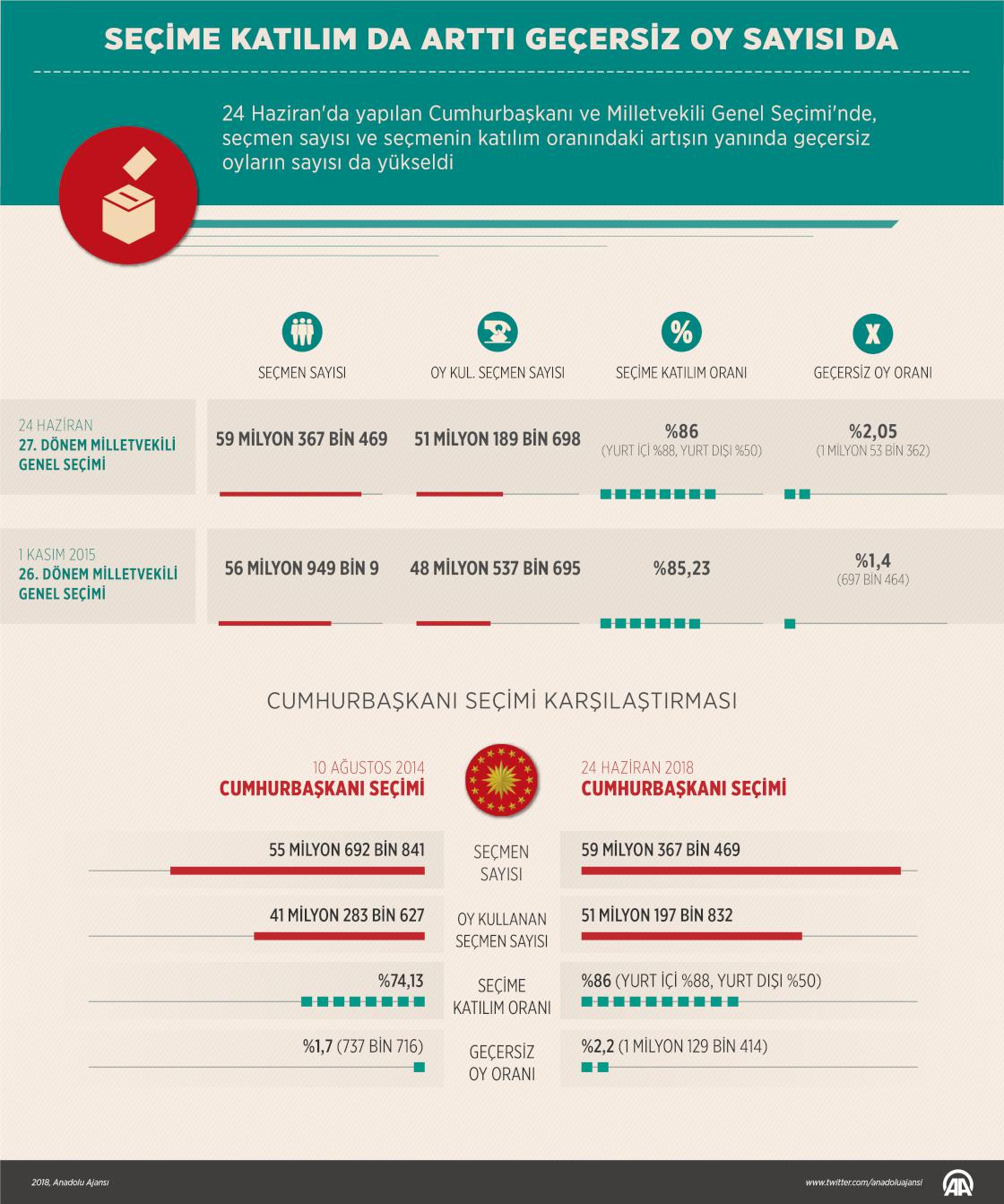 24 Haziran'da yapılan Cumhurbaşkanı ve 27. Dönem Milletvekili Genel Seçimi'nde seçmen sayısı ve seçime katılım oranı ile geçersiz oyların sayısında artış yaşandı. 27. Dönem Milletvekili Genel Seçimi için yurt içi ve yurt dışında toplam kayıtlı 59 milyon 367 bin 469 seçmenin 51 milyon 189 bin 698'i oy kullandı. Seçime katılma oranı yaklaşık yüzde 86 olarak hesaplandı. Toplam oyların 1 milyon 53 bin 362'si geçersiz sayıldı. Geçersiz oyların oranı yaklaşık yüzde 2,05 oldu. Seçime katılım yurt içinde yüzde 88, yurt dışında yüzde 50 olarak hesaplandı. Yurt içinde oyların yaklaşık 2,08'i, yurt dışında ise 1,27'si geçersiz sayıldı. ( Kemal Delikmen - Anadolu Ajansı )28 Haziran 2018•Güncelleme: 28 Haziran 2018