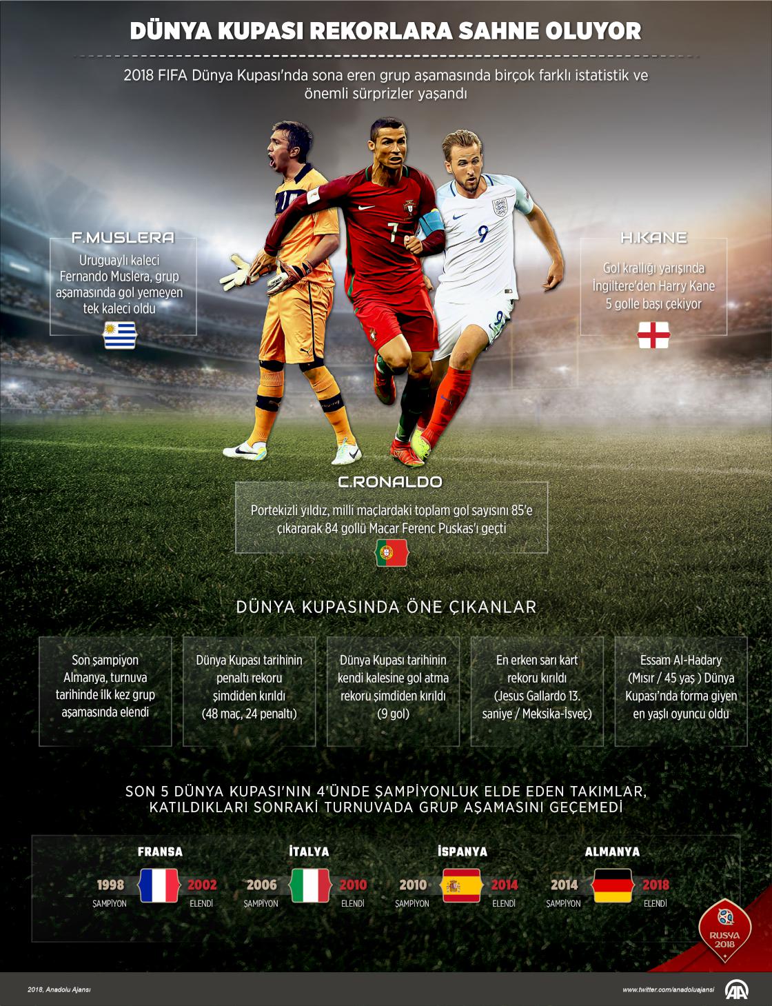 2018 FIFA Dünya Kupası'nın sona eren grup aşamasında en büyük sürprize turnuvaya veda eden son şampiyon Almanya imza attı. Rusya'nın ev sahipliği yaptığı turnuvada son 16 turu heyecanı başlarken, 48 karşılaşmanın yapıldığı grup aşamasında birçok farklı istatistik ve önemli sürprizler yaşandı. Brezilya'da düzenlenen 2014 Dünya Kupası'nda ve son olarak 2017 FIFA Konfederasyonlar Kupası'nda şampiyonluğa ulaşan Almanya, favori olarak katıldığı şampiyonada büyük hüsran yaşadı. ( Kemal Delikmen - Anadolu Ajansı )29 Haziran 2018•Güncelleme: 29 Haziran 2018