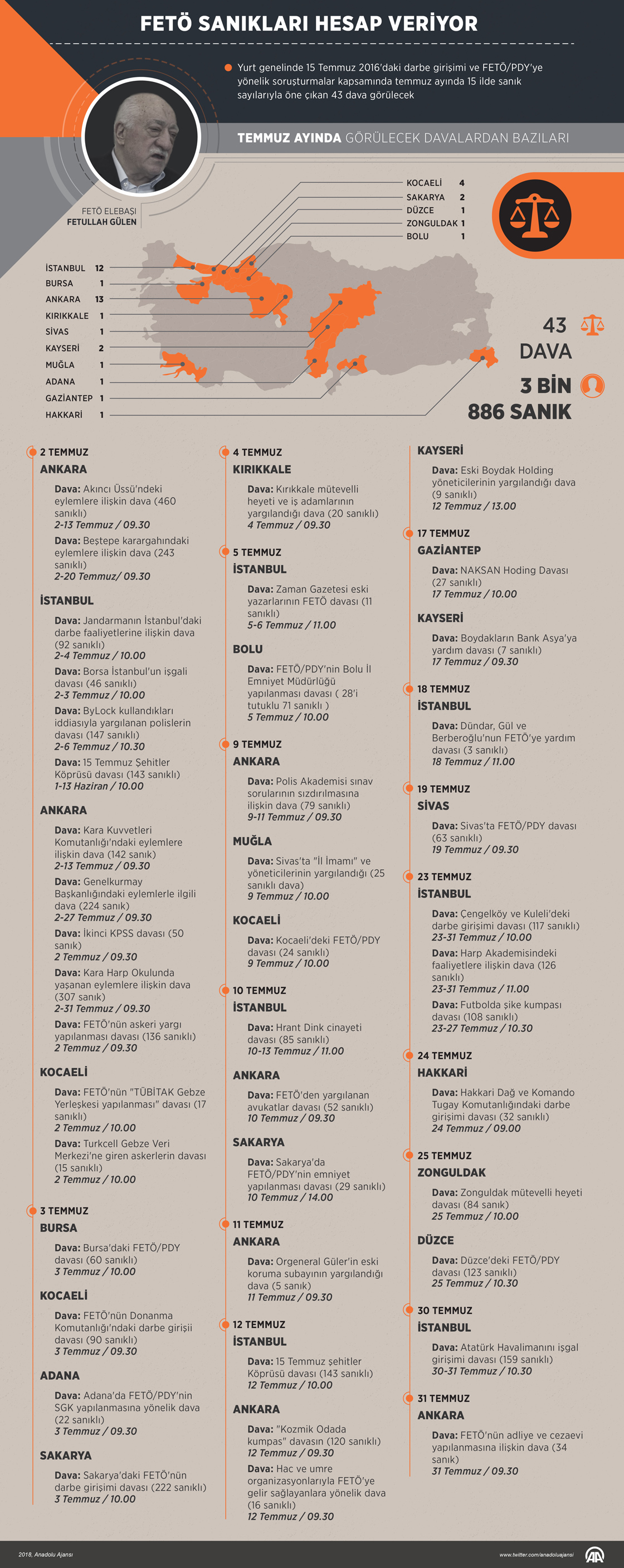 Terör Örgütü/Paralel Devlet Yapılanması'na (FETÖ/PDY) yönelik soruşturmalar kapsamında, temmuzda 15 ilde sanık sayılarıyla öne çıkan 43 davaya bakılacak. Darbe girişiminin ardından yurt genelinde cumhuriyet başsavcılıklarınca başlatılan soruşturmalar kararlılıkla devam ederken, tamamlanan soruşturmalar çerçevesinde açılan davalarda yargılamalar sürüyor. ( Muhammed Ali Yiğit - Anadolu Ajansı )01 Temmuz 2018•Güncelleme: 01 Temmuz 2018