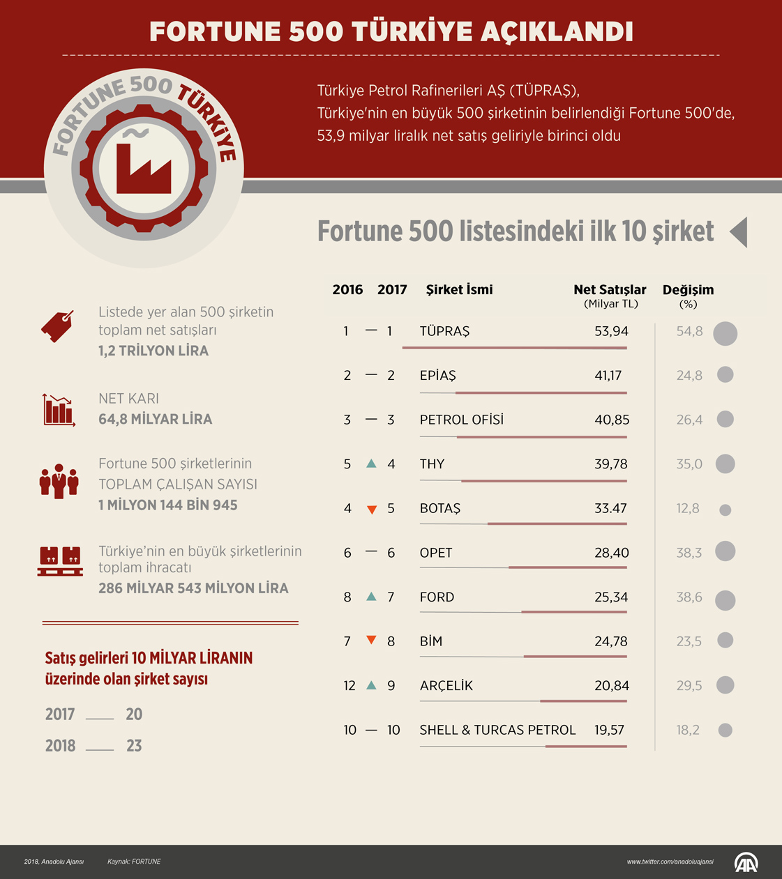 Türkiye Petrol Rafinerileri AŞ (TÜPRAŞ), Türkiye'nin en büyük 500 şirketinin belirlendiği Fortune 500'de, 53,9 milyar liralık net satış geliriyle birinci oldu. Finansal kurumlar ve holding şirketleri dışındaki tüm sektörleri kapsayan Fortune 500 Türkiye araştırmasının sonuçları, Fortune Türkiye yetkililerinin katılımıyla düzenlenen toplantıda açıklandı.02 Temmuz 2018•Güncelleme: 02 Temmuz 2018