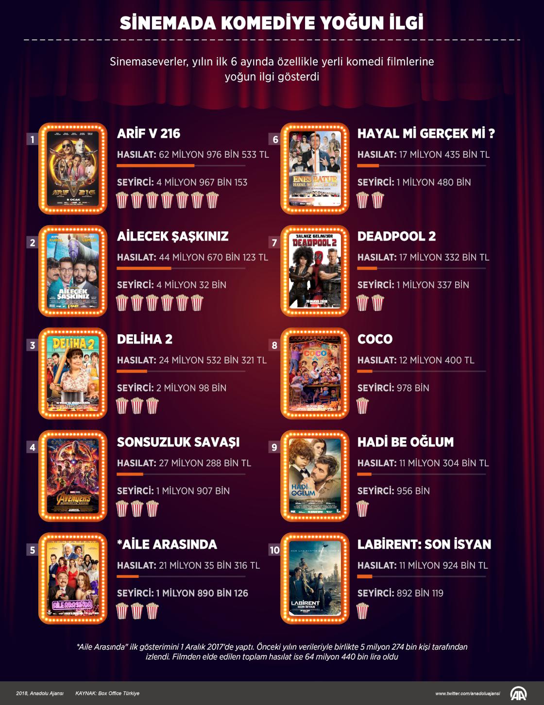 Sinemaseverler, yılın ilk 6 ayında özellikle yerli komedi filmlerine yoğun ilgi gösterdi. En çok izlenen 10 filmin 6'sını yerli filmler oluştururken, en çok gişe yapan film ise "Arif v 216" oldu. Box Office Türkiye'den derlenen bilgilere göre, yılın ilk yarısında en çok izlenen film, Cem Yılmaz'ın senaryosunu yazdığı ve başrolünde yer aldığı "Arif v 216" oldu. Film, vizyonda kaldığı süre içinde 4 milyon 967 bin 153 kişi tarafından seyredildi. Seyirciyle ilk kez Ocak ayında buluşan komedi ve bilim kurgu türündeki film, 18 Mayıs'taki ikinci vizyon tarihinin ardından toplam 62 milyon 976 bin 533 lira hasılat elde etti. ( Muhammed Ali Yiğit - Anadolu Ajansı )03 Temmuz 2018•Güncelleme: 03 Temmuz 2018