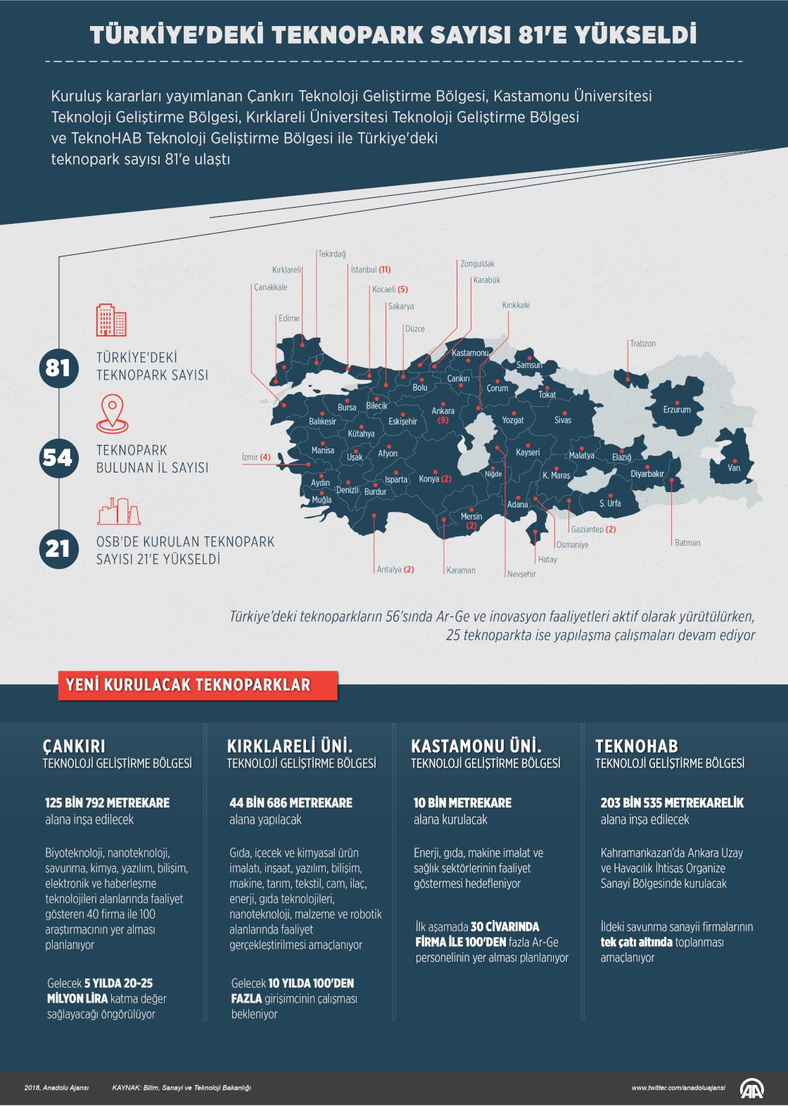 Bilim, Sanayi ve Teknoloji Bakanı Faruk Özlü, Resmi Gazete'de kuruluş kararları yayımlanan Çankırı Teknoloji Geliştirme Bölgesi, Kastamonu Üniversitesi Teknoloji Geliştirme Bölgesi, Kırklareli Üniversitesi Teknoloji Geliştirme Bölgesi ve TeknoHAB Teknoloji Geliştirme Bölgesi ile Türkiye'deki teknopark sayısının 81'e ulaştığını bildirdi. ( Kemal Delikmen - Anadolu Ajansı )03 Temmuz 2018•Güncelleme: 03 Temmuz 2018