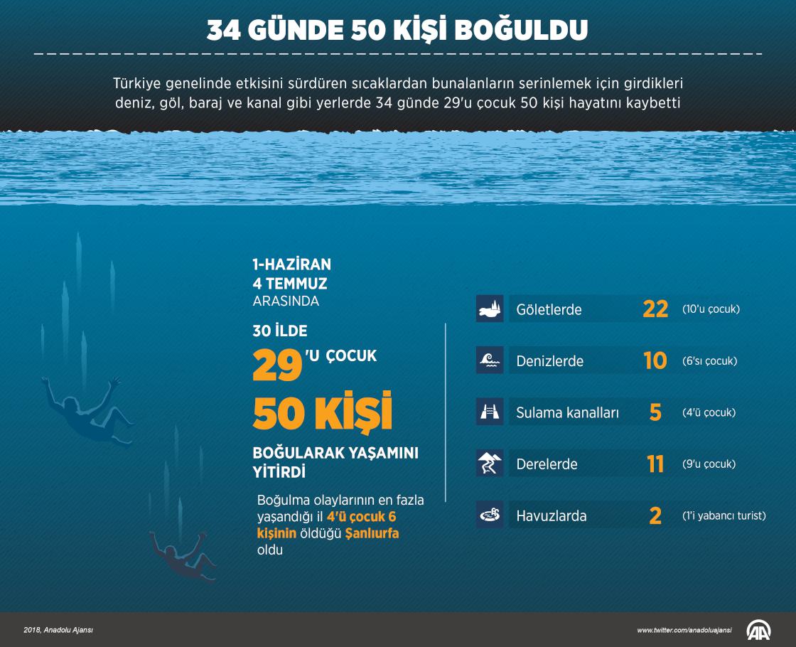 Türkiye genelinde etkisini sürdüren sıcaklardan bunalanların serinlemek için girdikleri deniz, göl, baraj ve kanal gibi yerlerde 34 günde 29'u çocuk 50 kişi hayatını kaybetti.