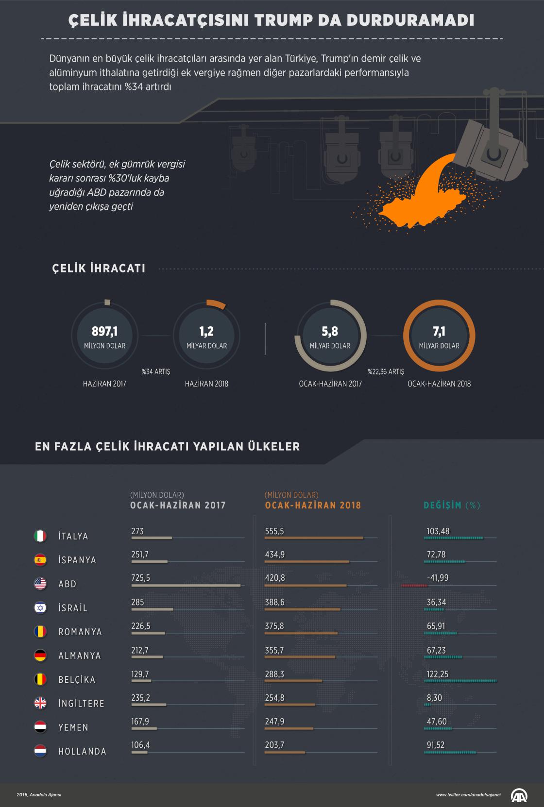 Dünyanın en büyük çelik ihracatçıları arasında yer alan Türkiye, ABD Başkanı Donald Trump'ın demir çelik ve alüminyum ithalatına getirdiği ek vergiye rağmen diğer pazarlardaki performansıyla toplam ihracatını yüzde 34 artırdı. Türkiye İhracatçılar Meclisi (TİM) verilerine göre, çelik ürünlerinde ihracat, haziran ayında geçen yılın aynı ayına göre yüzde 34 artışla 1 milyar 207 milyon dolara, ocak-haziran döneminde ise yüzde 22 artışla 7 milyar 104 milyon dolara çıktı. ( Kemal Delikmen - Anadolu Ajansı )05 Temmuz 2018•Güncelleme: 05 Temmuz 2018