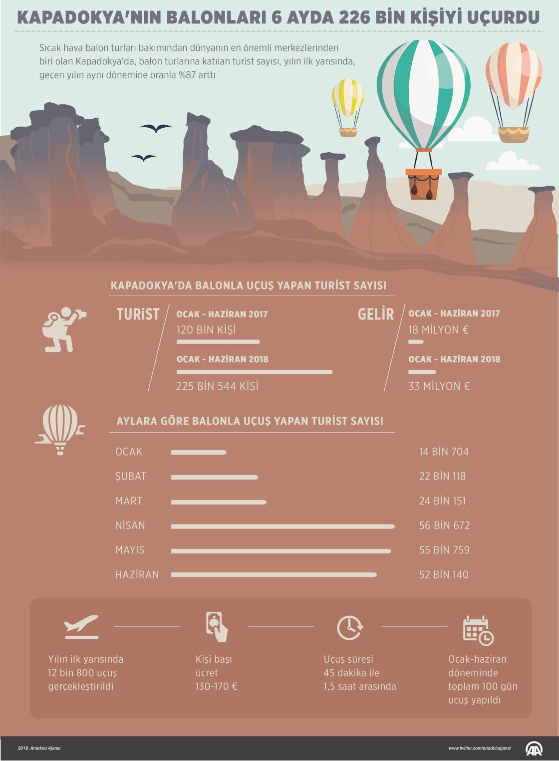 Tarihi, doğal ve kültürel zenginlikleriyle Türkiye'nin önemli turizm merkezleri arasında yer alan Kapadokya bölgesinin simgelerinden birisi haline gelen sıcak hava balon turlarına yılın ilk yarısında katılan turist sayısı, geçen yılın aynı dönemine kıyasla yüzde 87 oranında artış göstererek, 225 bin 544 kişiye ulaştı. ( Gözde Gültekinler - Anadolu Ajansı )05 Temmuz 2018•Güncelleme: 05 Temmuz 2018