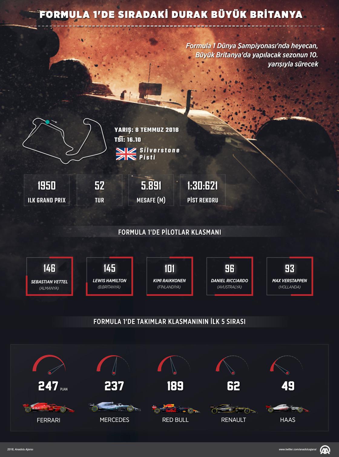 Formula 1 Dünya Şampiyonası'nda heyecan, Büyük Britanya'da yapılacak sezonun 10. yarışıyla sürecek. İngiltere'nin Northamptonshire bölgesindeki 5 bin 891 metrelik Silverstone Pisti'nde 52 tur üzerinden gerçekleştirilecek yarışın sıralama turları yarın TSİ 16.00'da başlayacak. Yarış ise 8 Temmuz Pazar günü TSİ 16.10'da koşulacak.