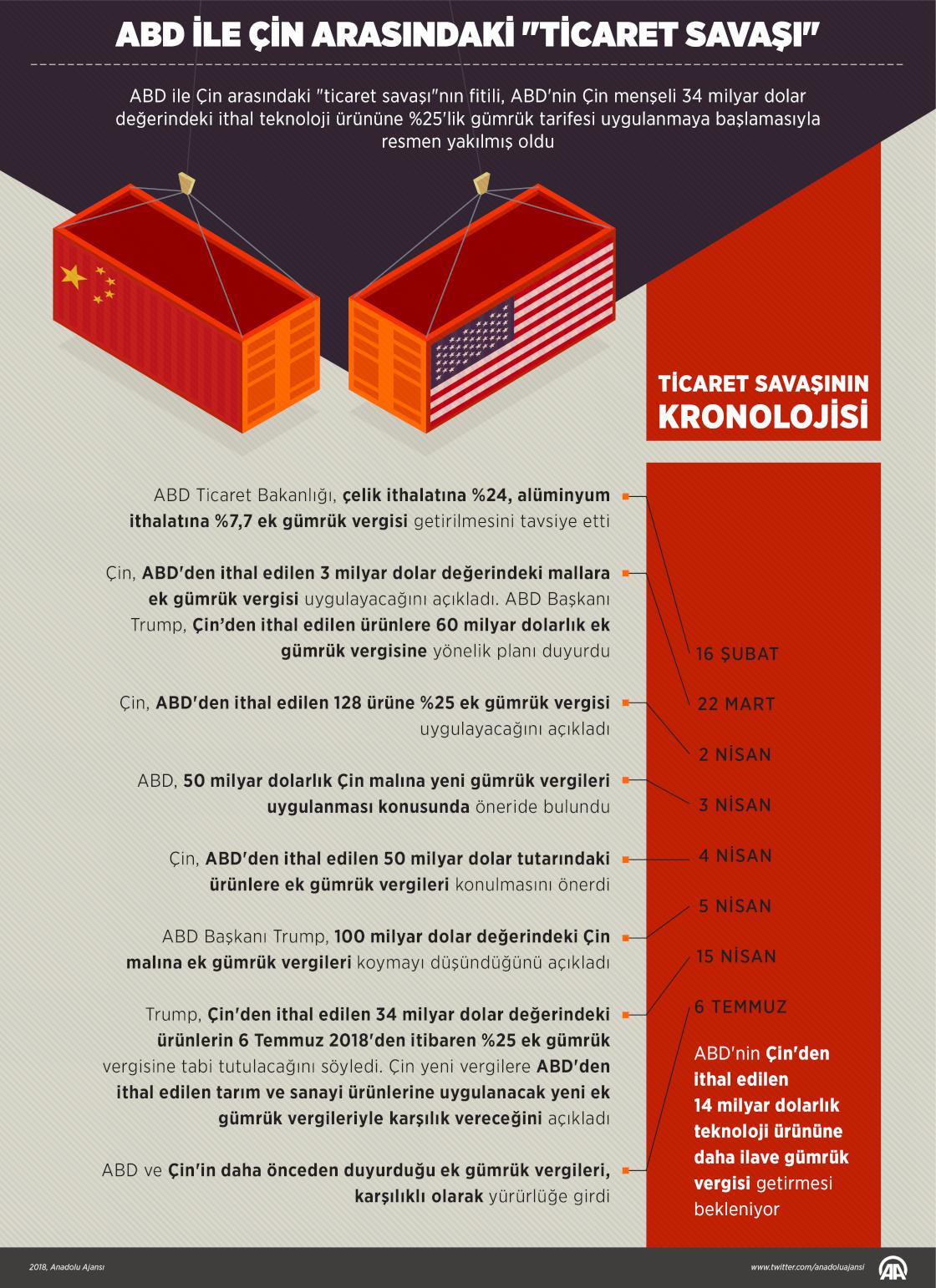 ABD ile Çin arasındaki "ticaret savaşı"nın fitili, ABD'nin dün geceden itibaren Çin menşeli 34 milyar dolar değerindeki ithal teknoloji ürününe yüzde 25'lik gümrük tarifesi uygulanmaya başlamasıyla resmen yakılmış oldu. ( Yasin Demirci - Anadolu Ajansı )06 Temmuz 2018•Güncelleme: 06 Temmuz 2018
