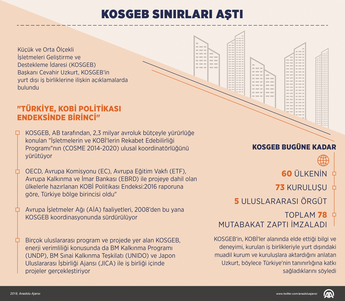 Küçük ve Orta Ölçekli İşletmeleri Geliştirme ve Destekleme İdaresi (KOSGEB) Başkanı Cevahir Uzkurt, KOSGEB'in bugüne kadar 60 ülkenin 73 kuruluşu ve 5 uluslararası örgütle toplam 78 mutabakat zaptı ve bu kapsamda gerçekleştirilebilecek faaliyetleri tanımlayan 7 eylem planı imzaladığını bildirdi.