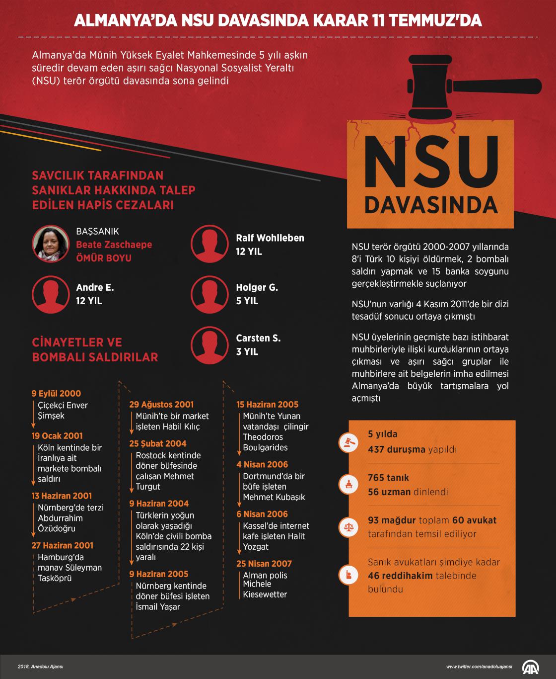 Almanya'da Münih Yüksek Eyalet Mahkemesinde 5 yılı aşkın süredir devam eden aşırı sağcı Nasyonal Sosyalist Yeraltı (NSU) terör örgütü davasında sona gelindi. NSU terör örgütü, 2000-2007 yıllarında 8'i Türk 10 kişiyi öldürmek, 2 bombalı saldırı düzenlemek ve 15 banka soygunu yapmakla suçlanıyor.