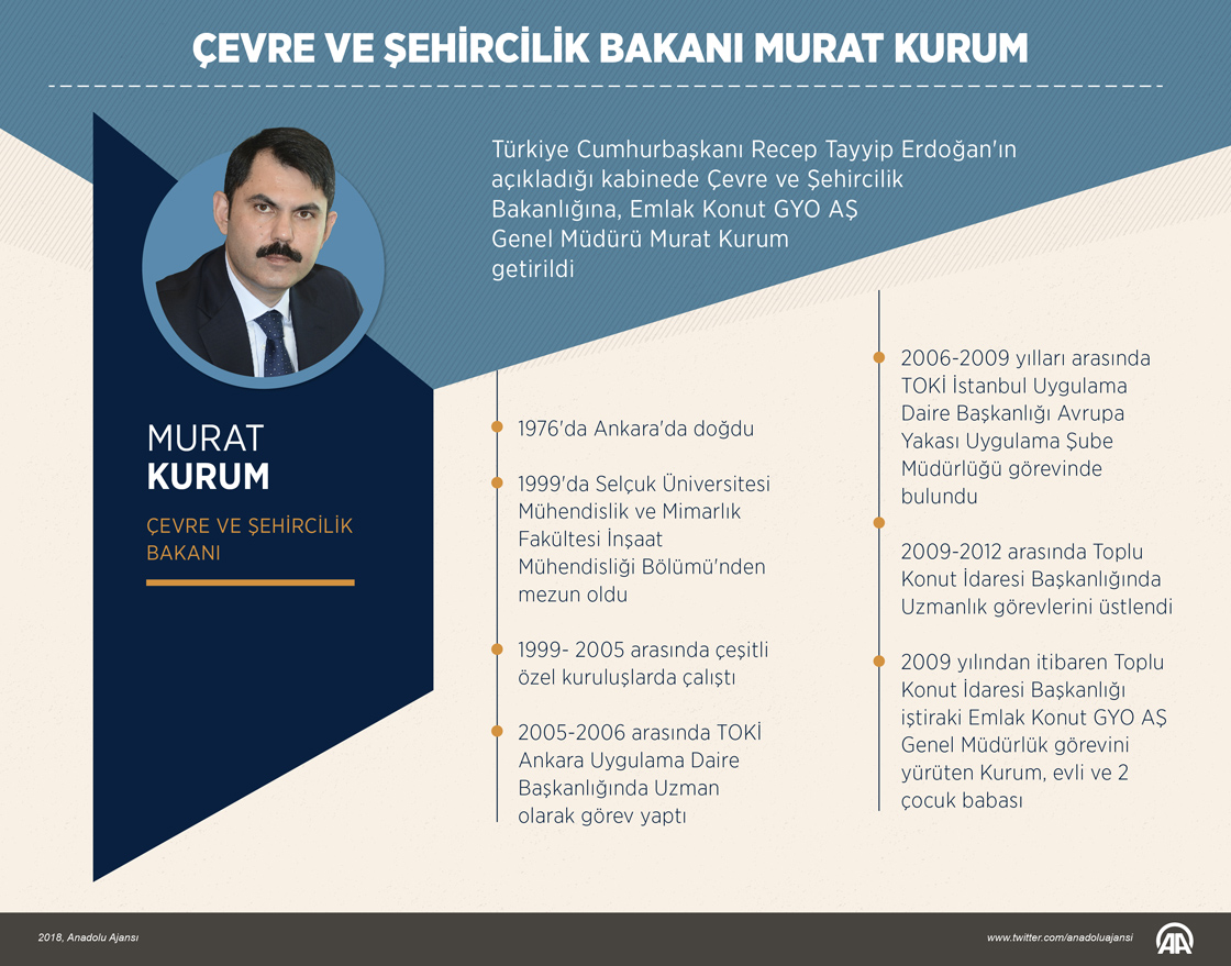 Türkiye Cumhurbaşkanı Recep Tayyip Erdoğan'ın açıkladığı kabinede Çevre ve Şehircilik Bakanlığına, Emlak Konut GYO AŞ Genel Müdürü Murat Kurum getirildi.