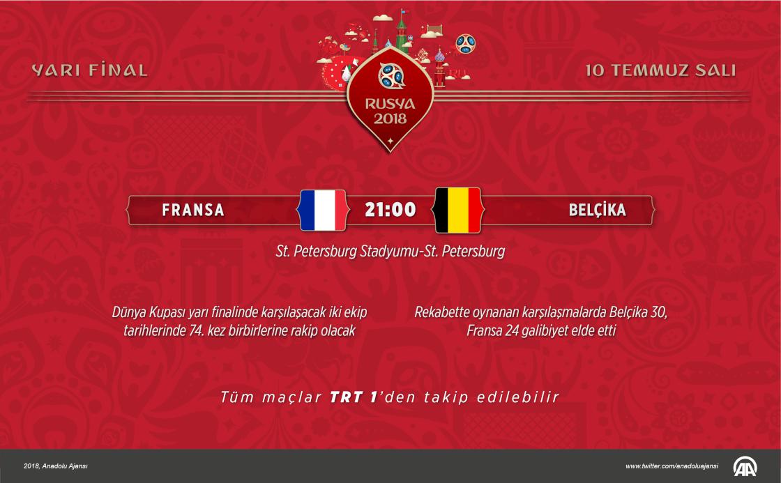 2018 FIFA Dünya Kupası yarı finalinde yarın karşılaşacak Fransa ile Belçika tarihlerinde 74. kez birbirlerine rakip olacak. Saint Petersburg Stadı'nda oynanacak ve finale yükselecek ilk ekibin belirleneceği Fransa-Belçika karşılaşması saat 21.00'de başlayacak. ( Kemal Delikmen - Anadolu Ajansı )10 Temmuz 2018•Güncelleme: 10 Temmuz 2018