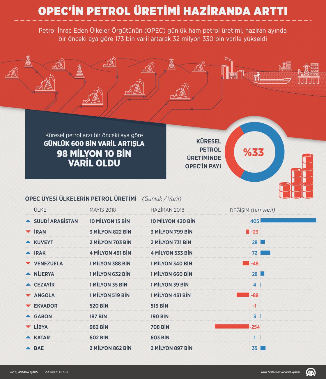 Petrol İhraç Eden Ülkeler Örgütünün (OPEC) günlük ham petrol üretimi, haziran ayında bir önceki aya göre 173 bin varil artarak 32 milyon 330 bin varile yükseldi.