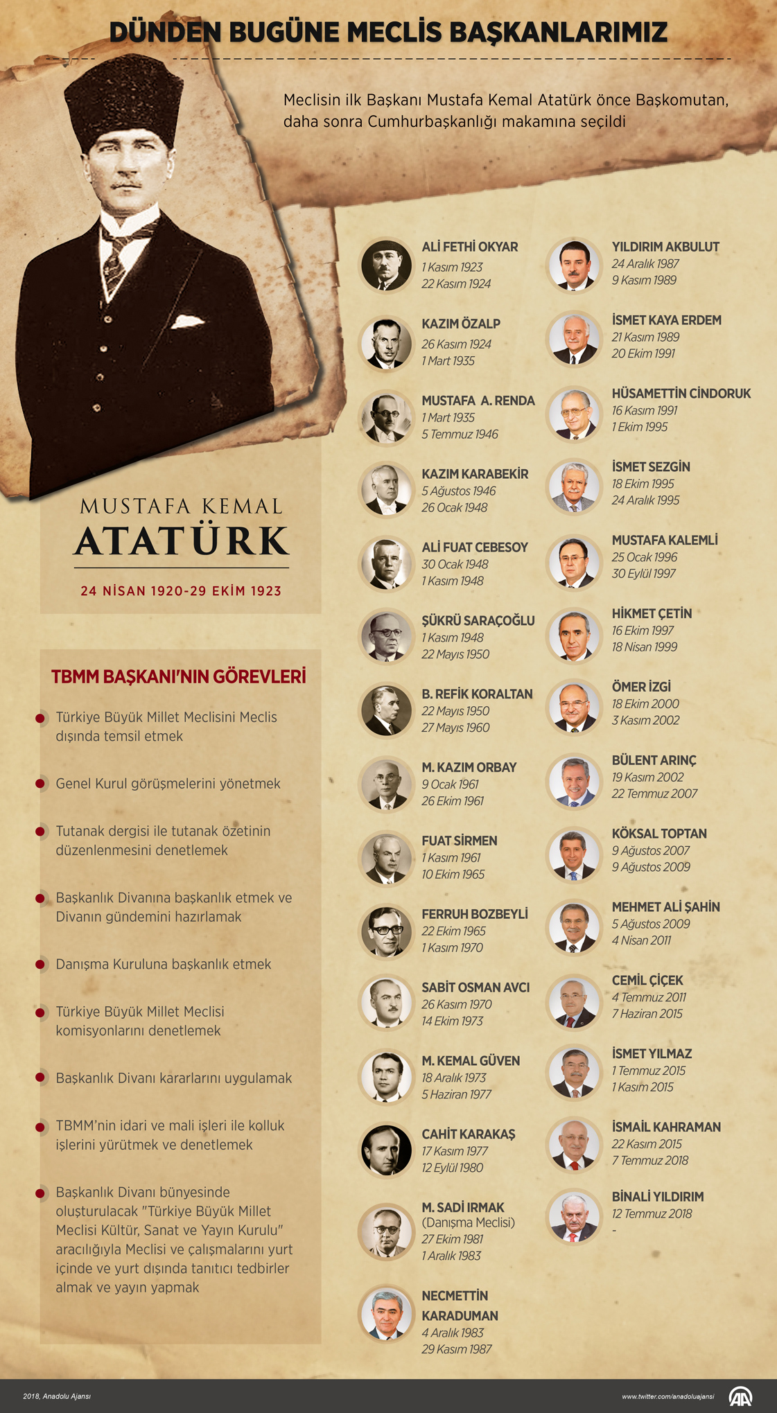 Meclisin ilk Başkanı Mustafa Kemal Atatürk önce Başkomutan, daha sonra Cumhurbaşkanlığı makamına seçildi. Dünyada TBMM Başkanlığı ve harpte fiili Başkomutanlık görevlerini aynı anda ve olağanüstü yetkiyle üstlenen ilk başkan Atatürk oldu.