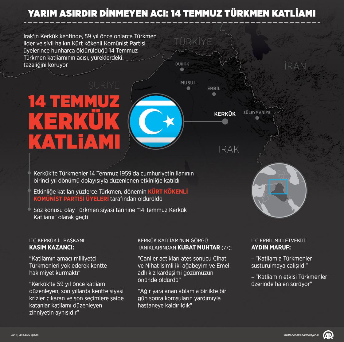 Irak'ın Kerkük kentinde, 59 yıl önce onlarca Türkmen lider ve sivil halkın Kürt kökenli Komünist Partisi üyelerince hunharca öldürüldüğü 14 Temmuz Türkmen katliamının acısı, yüreklerdeki tazeliğini koruyor. ( Murat Usubaliev - Anadolu Ajansı )13 Temmuz 2018•Güncelleme: 13 Temmuz 2018