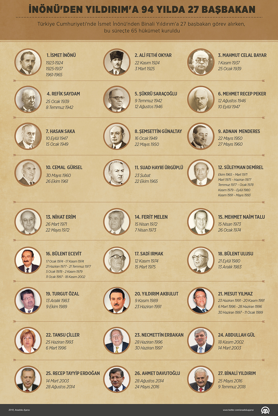 Türkiye Cumhuriyeti'nde ilk Başbakan İsmet İnönü'nden, son Başbakan Binali Yıldırım'a kadar 27 başbakan görev yaptı, bu süreçte 65 hükümet kuruldu.