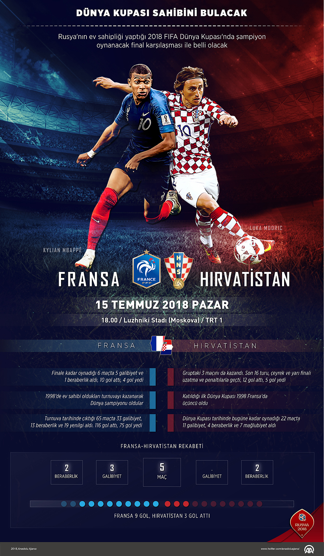 2018 FIFA Dünya Kupası finalinde Fransa ile Hırvatistan, yarın şampiyonluk için karşı karşıya gelecek.