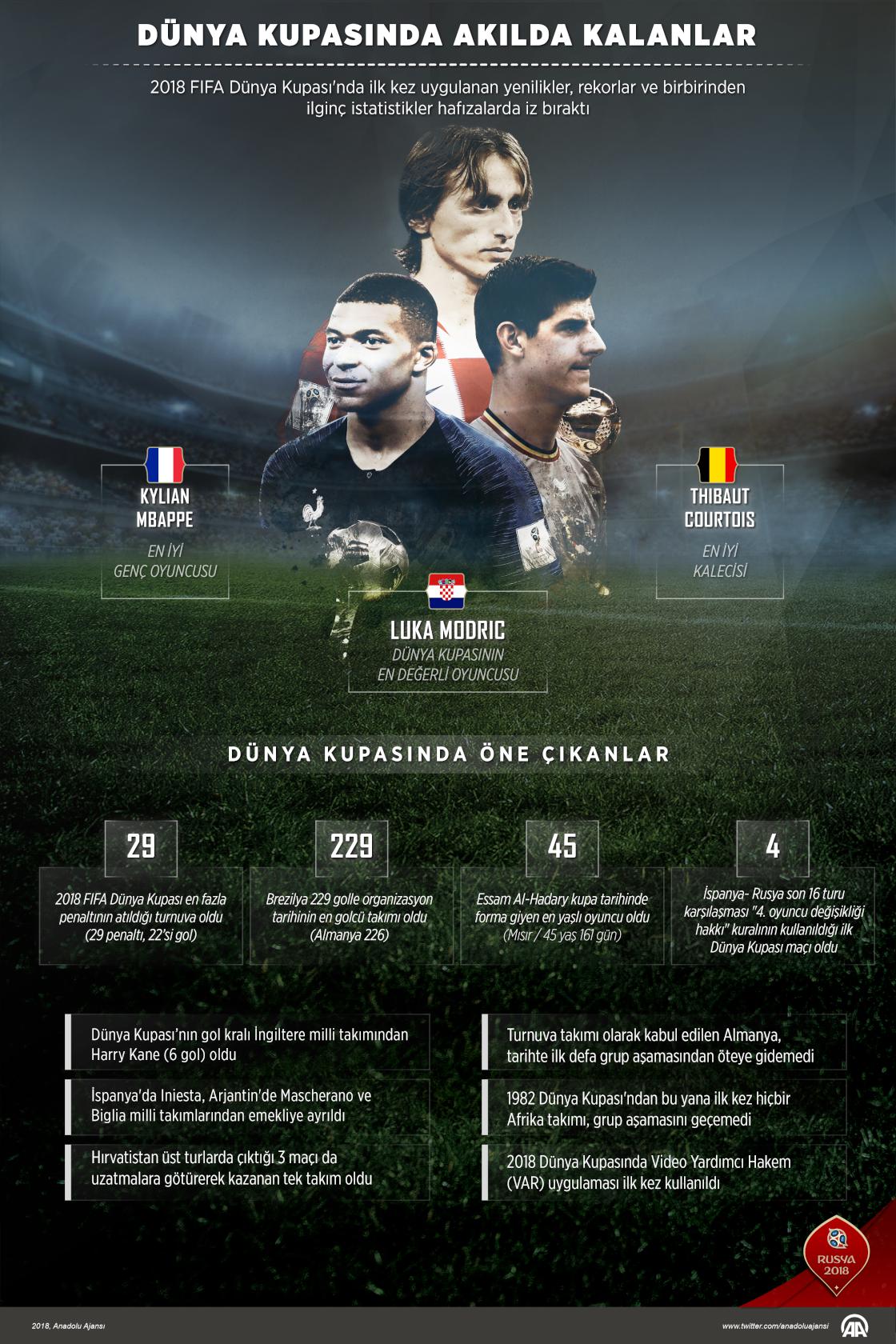 Brezilya, Almanya ve Portekiz gibi favori takımların çeşitli turlarda erken veda ettiği 2018 FIFA Dünya Kupası'nı müzesine götüren Fransa'da, 20 yıl aradan sonra kupayı kazanmanın gururu yaşanıyor. Rusya'nın ev sahipliğinde Fransa'nın zaferiyle sona eren 2018 FIFA Dünya Kupası, erken turlarda birçok favori adayın elenmesinin yanı sıra birçok farklı istatistiği ve ilkleriyle de öne çıktı. ( Kemal Delikmen - Anadolu Ajansı )16 Temmuz 2018•Güncelleme: 16 Temmuz 2018