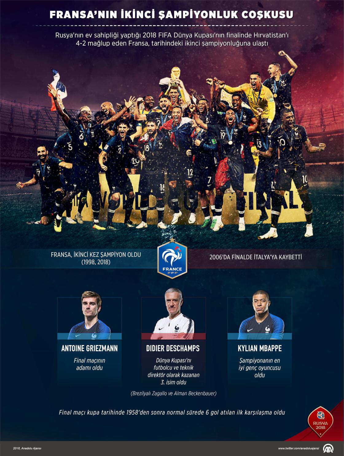 Rusya'nın ev sahipliği yaptığı 2018 FIFA Dünya Kupası'nın finalinde Hırvatistan'ı 4-2 mağlup eden Fransa, tarihindeki ikinci şampiyonluğuna ulaştı