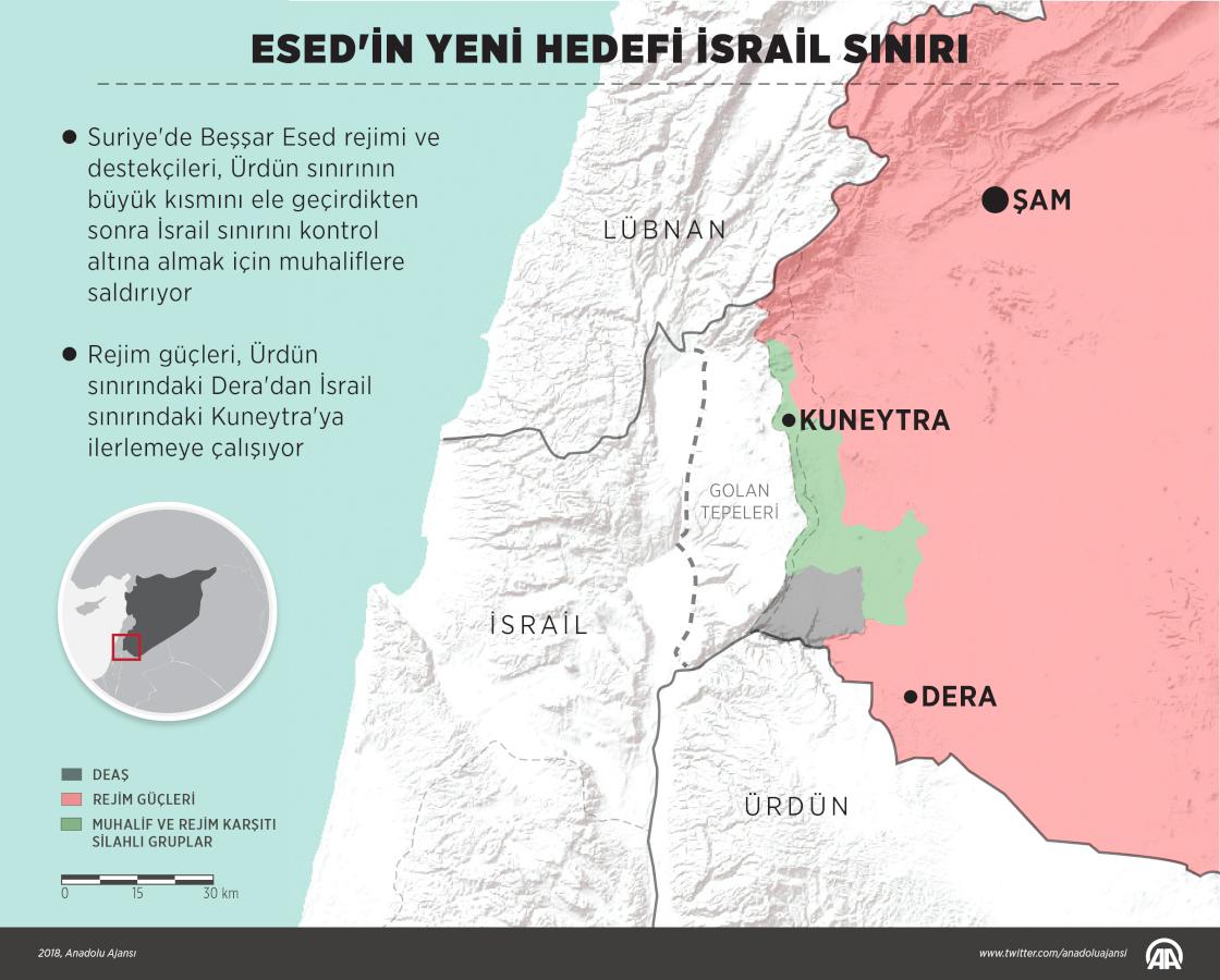Suriye'de Beşşar Esed rejimi ve destekçileri, Ürdün sınırının büyük kısmını ele geçirdikten sonra İsrail sınırını kontrol altına almak için muhaliflere saldırıyor. İsrail işgalindeki Golan Tepeleri'ne sınır bölgede çatışmalar yaşanıyor.