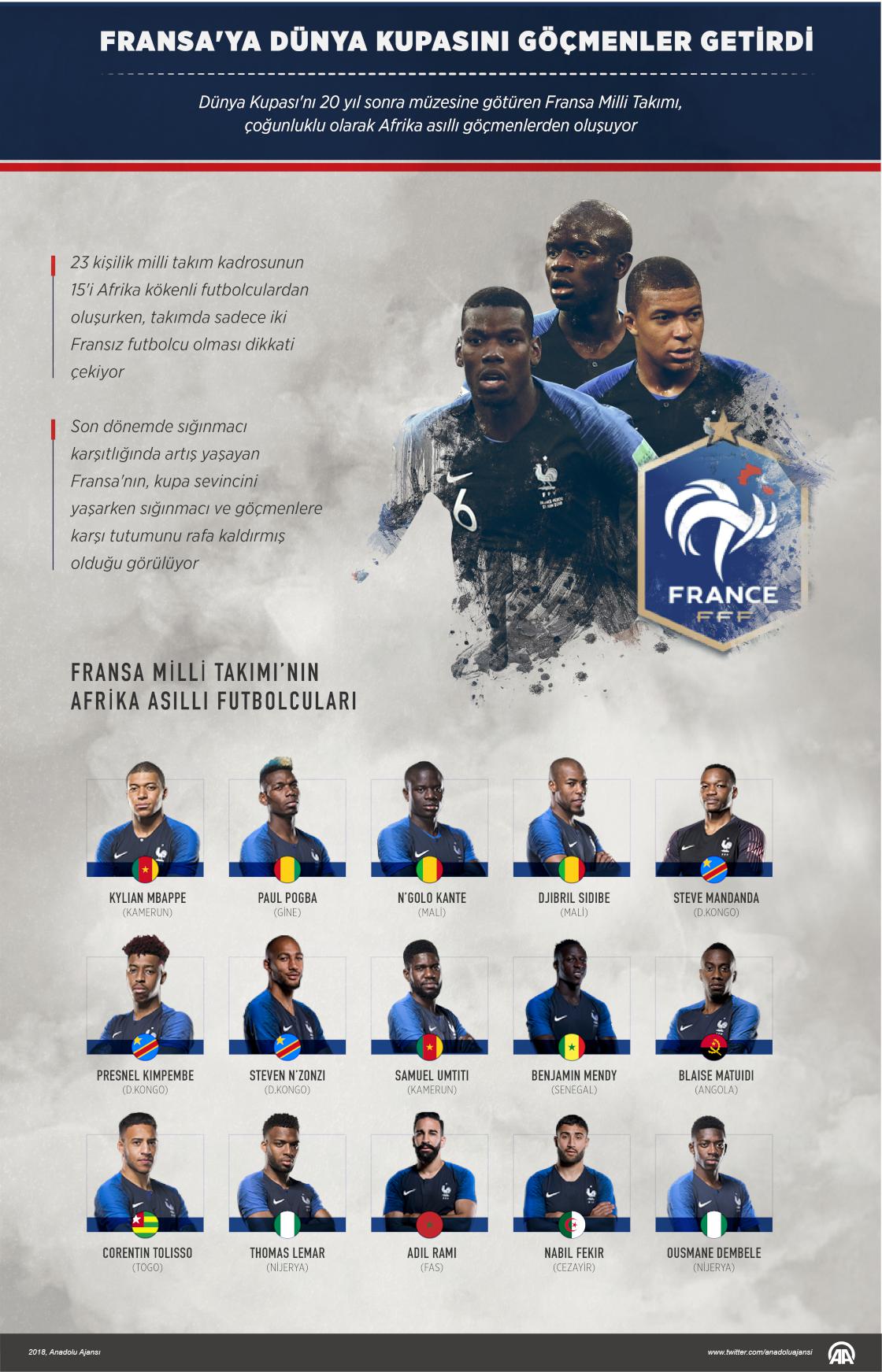 Fransa'da göçmen karşıtı tutumun giderek yoğunluk kazandığı bir dönemde, ülkeyi Dünya Kupası'nda şampiyonluğa taşıyan milli takım futbolcularının çoğunun Afrika kökenli göçmenlerden oluşması dikkati çekti. ( Kemal Delikmen - Anadolu Ajansı )