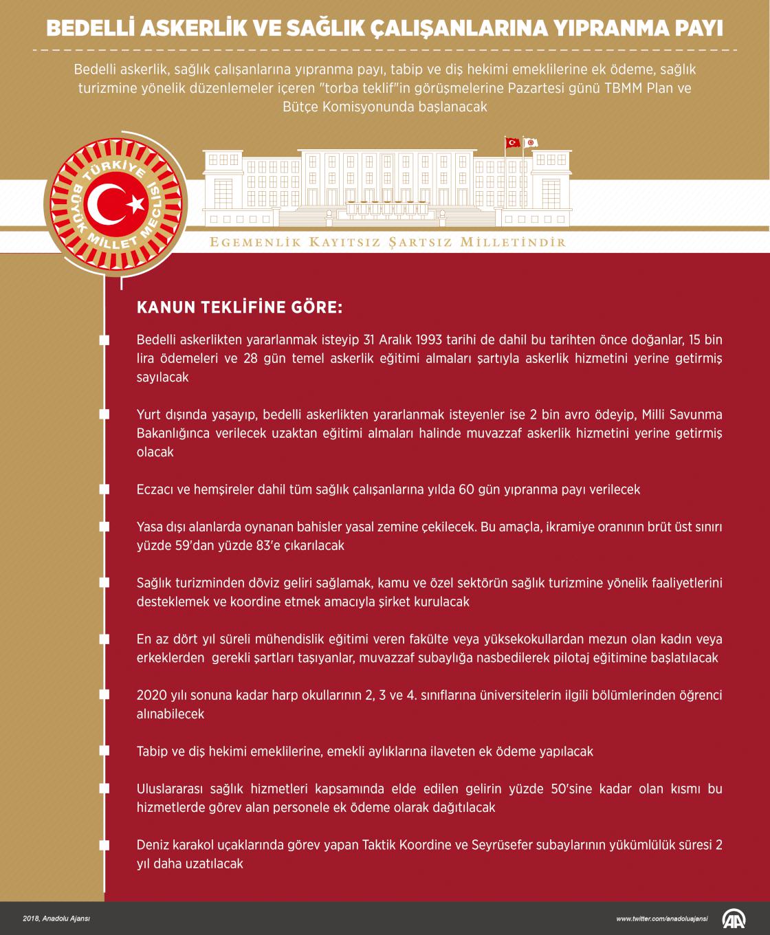 Bedelli askerlik, sağlık çalışanlarına yıpranma payı, tabip ve diş hekimi emeklilerine ek ödeme gibi düzenlemeler içeren "torba teklif"in görüşmelerine 23 Temmuz pazartesi günü TBMM Plan ve Bütçe Komisyonunda başlanacak. ( Muhammed Ali Yiğit - Anadolu Ajansı )19 Temmuz 2018•Güncelleme: 19 Temmuz 2018