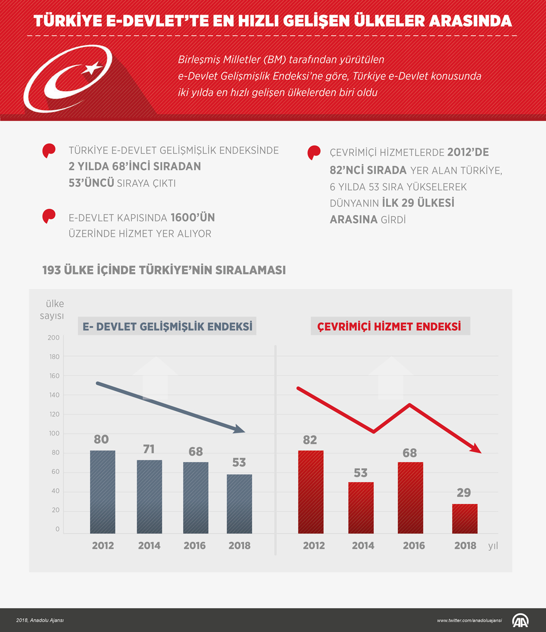 Ulaştırma ve Altyapı Bakanı Cahit Turhan, Birleşmiş Milletler (BM) tarafından yürütülen e-Devlet Gelişmişlik Endeksi'ne göre, Türkiye'nin bu alanda iki yılda en hızlı gelişen ülkelerden biri olduğunu belirterek, "e-Devlet Gelişmişlik Endeksi'nde ülkemiz 2 yılda 68'inci sıradan 53'üncü sıraya çıktı." dedi. Turhan, AA muhabirine yaptığı açıklamada, e-Devlet ile ilgili ölçümleme çalışmaları içinde en çok bilinen ve takip edilen çalışmanın, BM tarafından yürütülen e-Devlet Gelişmişlik Endeksi olduğunu belirtti.21 Temmuz 2018•Güncelleme: 21 Temmuz 2018
