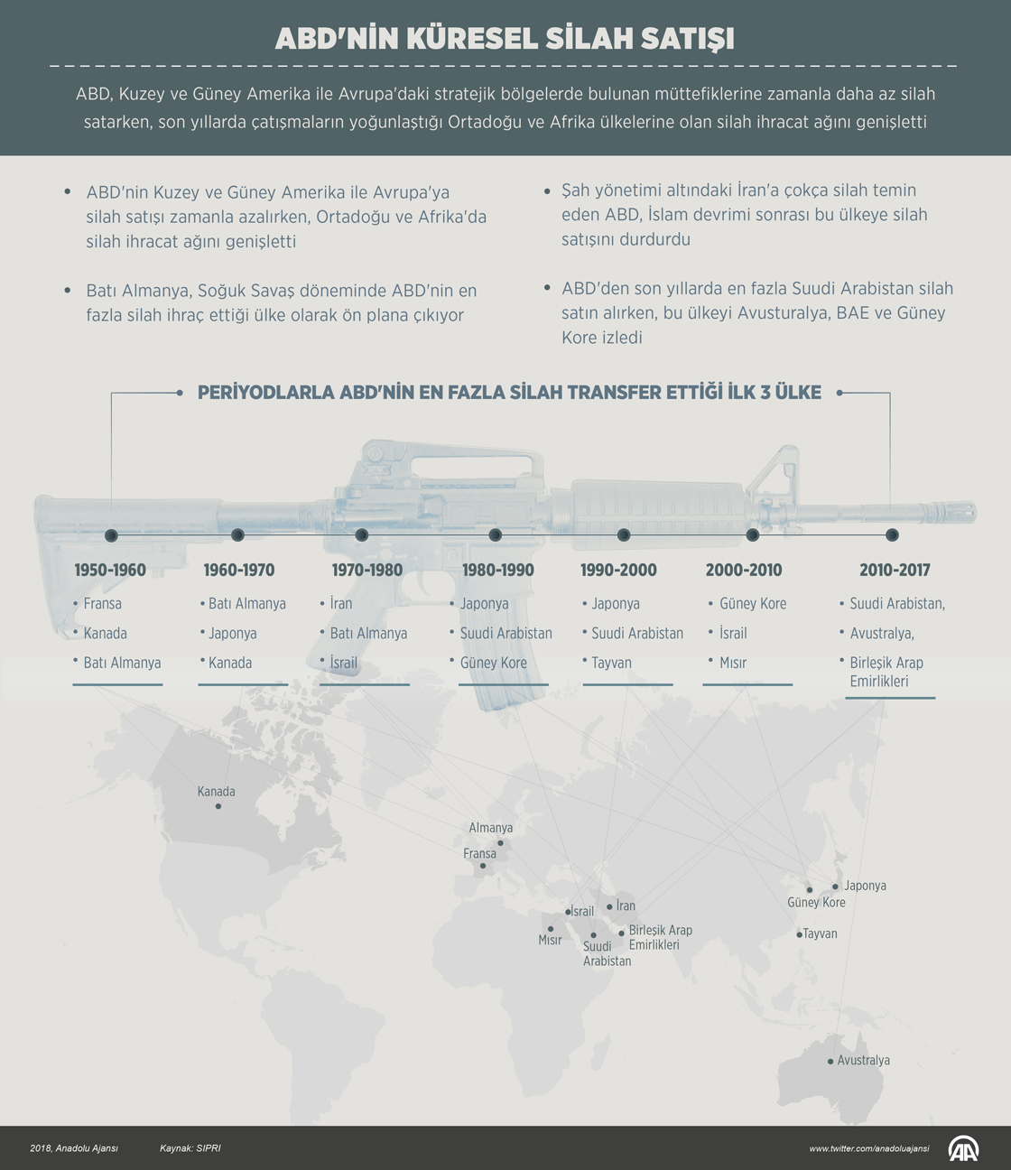 ABD, Kuzey ve Güney Amerika ile Avrupa'daki stratejik bölgelerde bulunan müttefiklerine zamanla daha az silah satarken, son yıllarda çatışmaların yoğunlaştığı Ortadoğu ve Afrika ülkelerine olan silah ihracat ağını genişletti. AA muhabirinin Stockholm Uluslararası Barış Araştırmaları Enstitüsünden (SIPRI) derlediği verilere göre, dünyanın en büyük silah ihracatçısı ABD'nin 1950'den bugüne bölgelere ve ülkelere göre silah satışındaki farklılık dikkati çekiyor.21 Temmuz 2018•Güncelleme: 21 Temmuz 2018