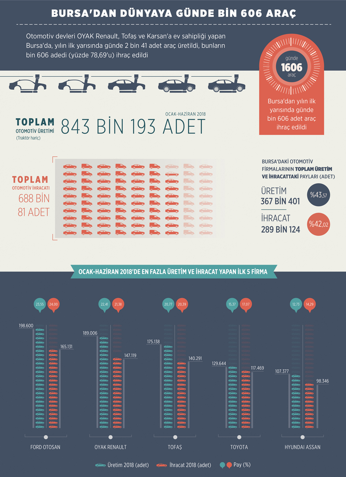Otomotiv devleri OYAK Renault, Tofaş ve Karsan'a ev sahipliği yapan Bursa'da, yılın ilk yarısında günde 2 bin 41 adet araç üretildi, bunların ortalama bin 606 adedi (yüzde 78,69'u) ihraç edildi. ( Kemal Delikmen - Anadolu Ajansı )