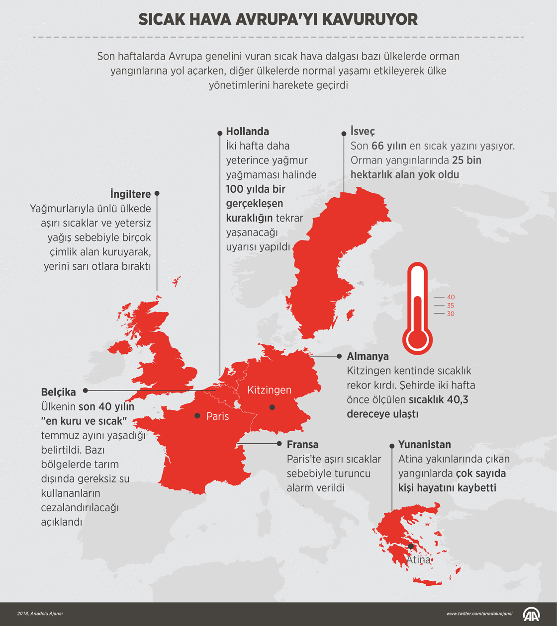 Avrupa'da son haftalarda etkili sıcak hava dalgası, bazı ülkelerde orman yangınlarına yol açarak can ve mal kayıplarına neden olurken, diğerlerinde de günlük yaşamı etkileyerek ülke yönetimlerini harekete geçirdi. ( Zeynep Öztürk - Anadolu Ajansı )