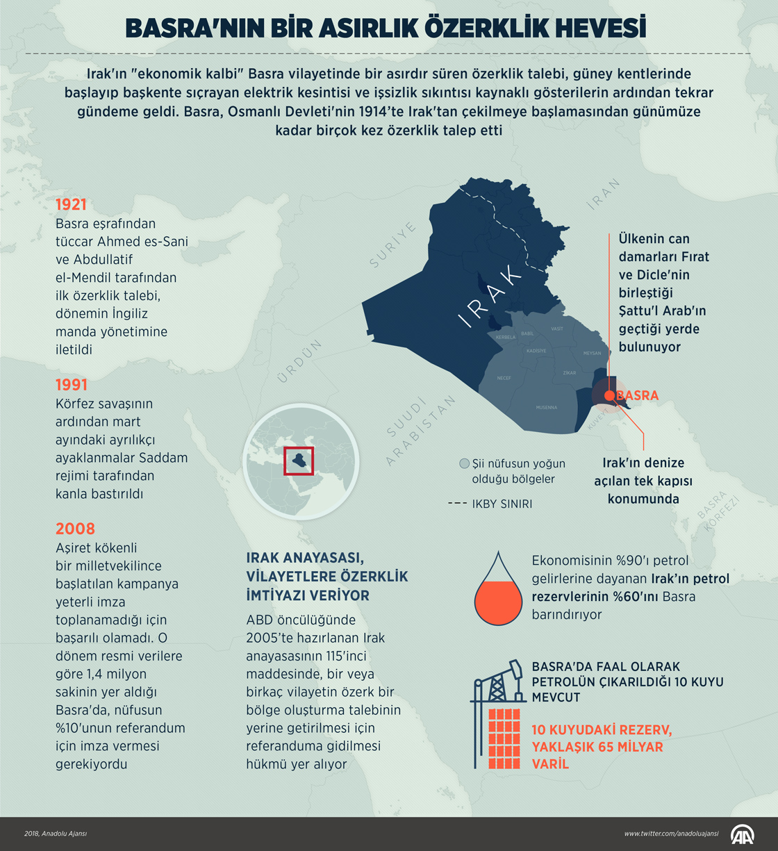 Irak'ın "ekonomik kalbi" Basra vilayetinde bir asırdır süren özerklik talebi, elektrik kesintisi ve işsizlik sıkıntısı gerekçesiyle patlak veren gösterilerin ardından tekrar gündeme geldi. ( Yasin Demirci - Anadolu Ajansı )