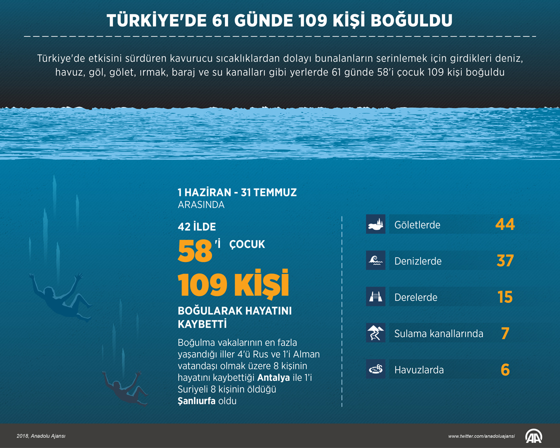 Türkiye'de etkisini sürdüren kavurucu sıcaklıklardan dolayı bunalanların serinlemek için girdikleri deniz, havuz, göl, gölet, ırmak, baraj ve su kanalları gibi yerlerde 61 günde 58'i çocuk 109 kişi boğuldu. ( Murat Usubaliev - Anadolu Ajansı )