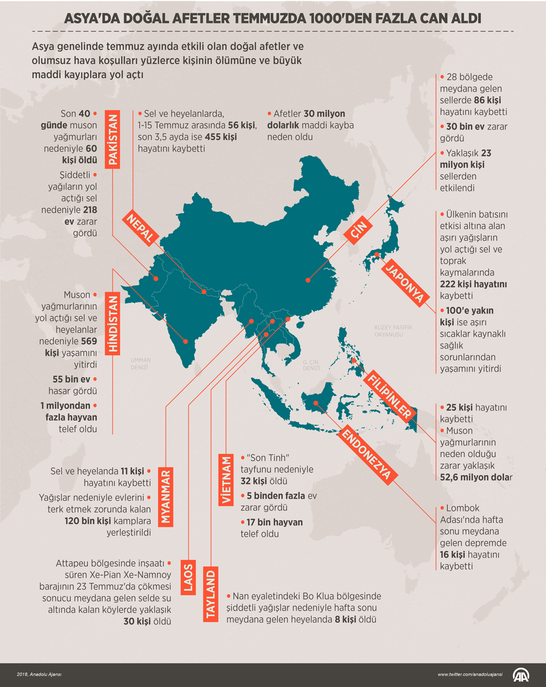 Asya genelinde temmuz ayında etkili olan doğal afetler ve olumsuz hava koşulları yüzlerce kişinin ölümüne ve büyük maddi kayıplara yol açtı. Güney Asya, Güneydoğu Asya ve Doğu Asya'yı etkisi altına alan afetlerde binden fazla kişi yaşamını yitirdi. ( Ahmet Burak Özkan - Anadolu Ajansı )02 Ağustos 2018•Güncelleme: 02 Ağustos 2018