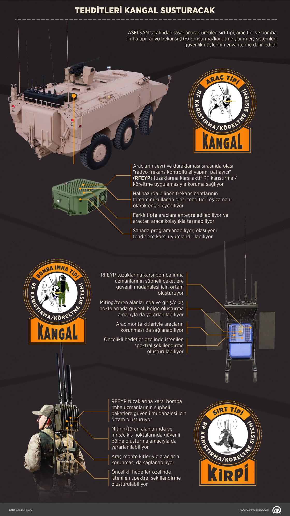 Uzaktan kumandalı sistemlerle gerçekleştirilen saldırıların etkisiz hale getirilmesine yönelik olarak güvenlik güçlerinin teknolojik olanakları güçlendiriliyor. Savunma Sanayii Başkanlığının koordinasyonunda, ASELSAN tarafından tasarlanarak üretilen sırt tipi, araç tipi ve bomba imha tipi radyo frekansı (RF) karıştırma/köreltme (jammer) sistemleri güvenlik güçlerinin envanterine dahil edildi. Kangal Araç Tipi Jammer, programlamaya yetkili kullanıcı seviyesinde, sahada programlanabiliyor, olası yeni tehditlere karşı uyumlandırılabiliyor. Kangal Bomba İmha Tipi RF Karıştırma/Köreltme Sistemi ise olası RFEYP tuzaklarına karşı bomba imha uzmanlarının şüpheli paketlere güvenli müdahalesi için ortam oluşturuyor. İkinci Nesil Sırt Tipi RF Karıştırma/Köreltme Sistemi MİLKAR-5T5, RFEYP tuzaklarına karşı timlerin ve yaya personelin korunması amacıyla geliştirilerek güvenlik güçlerinin hizmetine girdi. ( Murat Usubaliev - Anadolu Ajansı )03 Ağustos 2018•Güncelleme: 03 Ağustos 2018