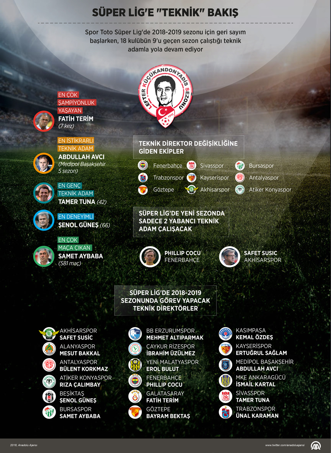 Spor Toto Süper Lig'de 2018-2019 sezonu için geri sayım başlarken, 18 kulübün 9'u geçen sezon çalıştığı teknik adamla yola devam ediyor. Türk Milli Takımı ve Fenerbahçe'nin efsane futbolcularından Lefter Küçükandonyadis'in adının verildiği sezonda mücadele edecek 18 takımdan 9'u ise yeni teknik direktörlerle başarı kovalayacak.