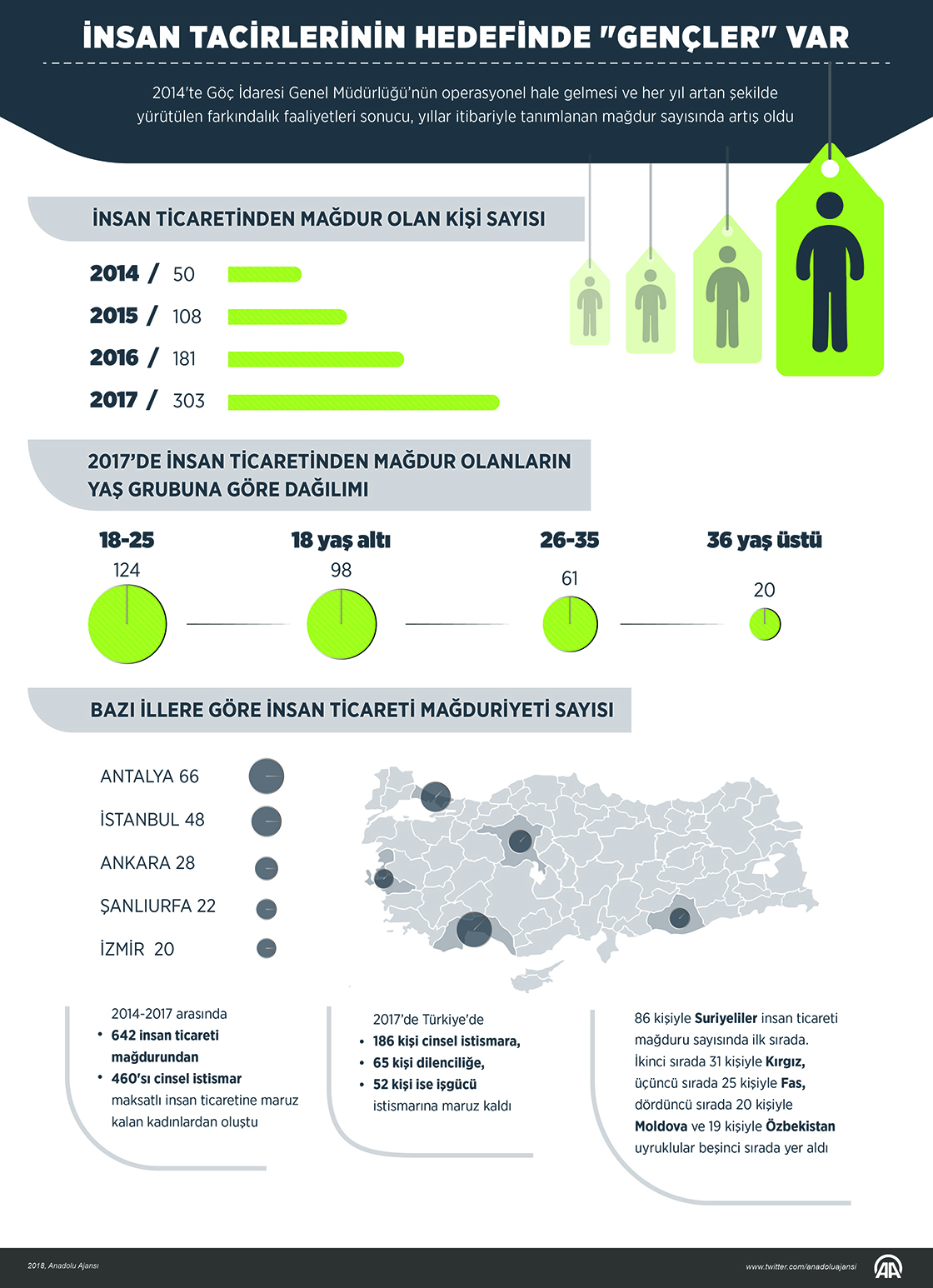 İçişleri Bakanlığı Göç İdaresi Genel Müdürlüğü verilerine göre, geçen yıl insan ticaretinden mağdur olan 303 kişiden 222'si 25 yaşın altındaki gençlerden oluşuyor.