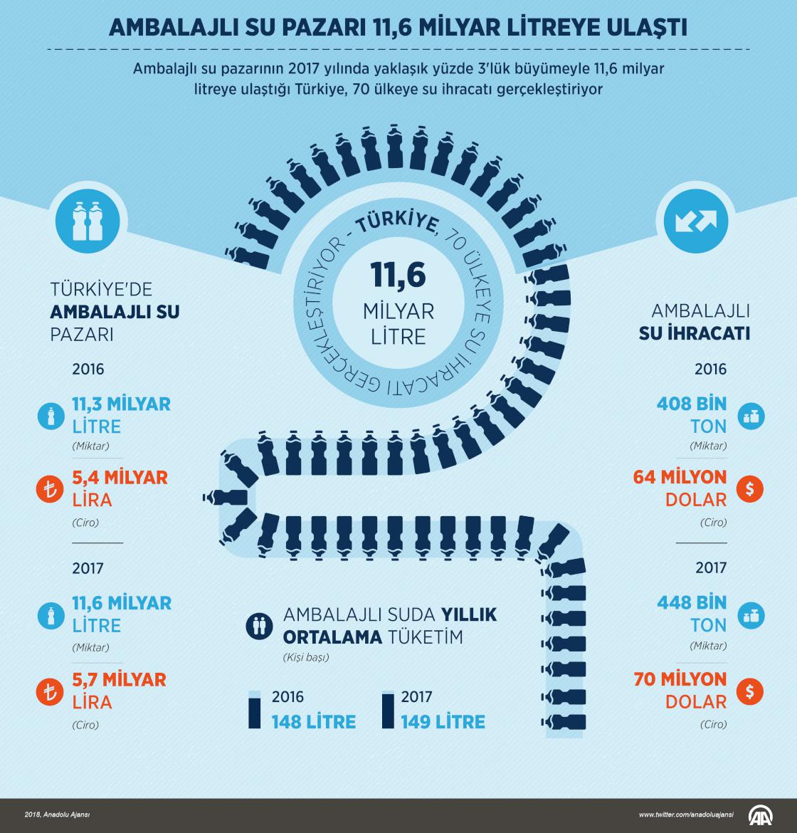 Türkiye'de ambalajlı su pazarı, geçen yıl yaklaşık yüzde 3'lük büyümeyle 11,6 milyar litreye, cirosu ise 5,7 milyar liraya çıktı. İhraç edilen ambalajlı su ise yaklaşık 448 bin ton ve 70 milyon dolar oldu. ( Ahmet Burak Özkan - Anadolu Ajansı )10 Ağustos 2018•Güncelleme: 10 Ağustos 2018