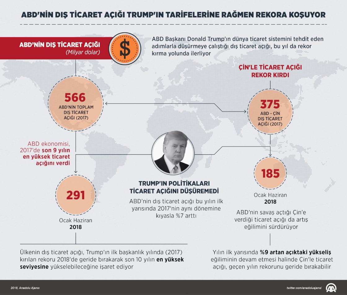 Trump yönetiminin son 1,5 yılda "Önce Amerika" sloganıyla uygulamaya koyduğu korumacı ticaret politikalarının sonuçları uzun süredir tartışılıyor. ABD Ticaret Bakanlığı verileri, Trump'ın ticaret açığını düşürme hedefiyle uygulanan "tarifelerin çok işe yaradığı" argümanını desteklemiyor. ( Murat Usubaliev - Anadolu Ajansı )10 Ağustos 2018•Güncelleme: 10 Ağustos 2018