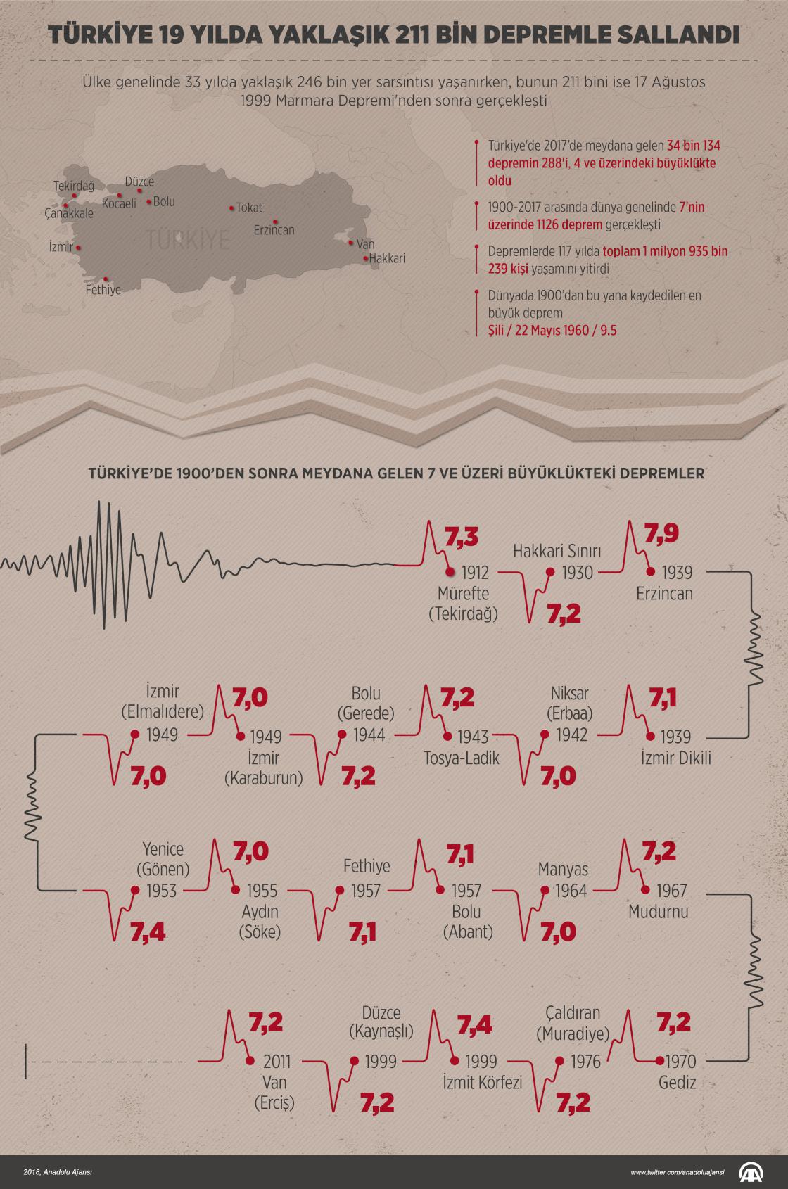 Türkiye ve yakın çevresinde, 1900 ile 31 Aralık 2017 arasında 4 ve üzerindeki büyüklükte 10 bin 503, 17 Ağustos 1999 Marmara depreminden bu yana ise yaklaşık 211 bin deprem meydana geldi.